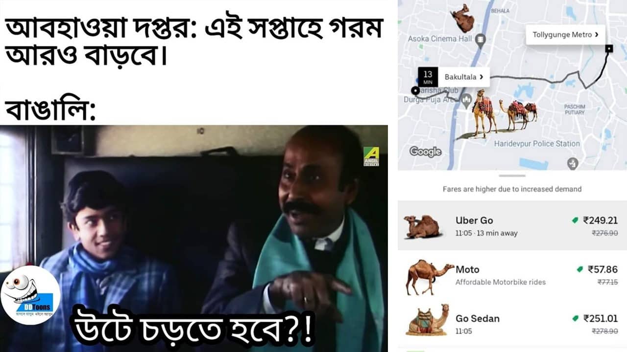 নেটিজেনরা বলছেন, বৃষ্টির যখন দেখা মিলবেই না, তখন উটের পিঠে চেপে ঘোরা যাক। সোশ্যাল মিডিয়ায় কার্যত মরু শহরের রূপ দেওয়া হয়েছে কলকাতাকে।