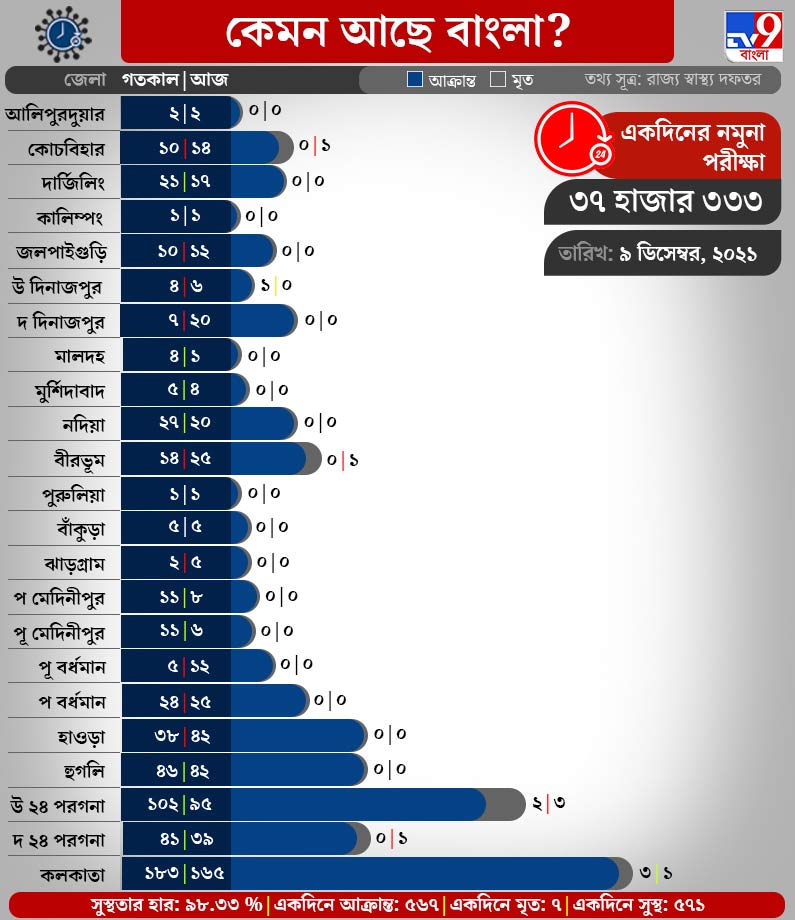 একদিনে সুস্থ হয়ে বাড়ি ফিরে গিয়েছেন ৫৭১ জন। সুস্থতার হার ৯৮.৩৩ শতাংশ। গত ২৪ ঘণ্টায় কোভিডের নমুনা পরীক্ষা হয়েছে ৩৭ হাজার ৩৩৩টি। পজিটিভিটি রেট ১.৫২ শতাংশ। এখনও রাজ্যে সক্রিয় করোনা রোগীর সংখ্যা ৭ হাজার ৫৬৫ জন।