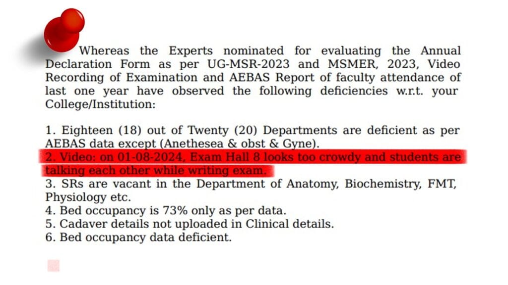 এনএমসি-র চিঠিতে উল্লেখ করা আছে, এনআরএসের ২০টি বিভাগের মধ্যে ১৮টি বিভাগে শিক্ষক চিকিৎসকদের হাজিরা ঘাটতি রয়েছে। এনআরএসে ডাক্তারদের গরহাজিরা দেখে রীতিমতো চক্ষু চড়কগাছ ন্যাশনাল মেডিক্যাল কমিশন। তিলোত্তমা কাণ্ডের আগে পরীক্ষার হলের ফুটেজ দেখেও উদ্বিগ্ন এনএমসি! পরীক্ষার হলে অবাধে টোকাটুকির অভিযোগ তুলেছে এনএসসি’রও! হাসপাতালে রোগী ভর্তির হারও সন্তোষজনক নয় বলে উল্লেখ করা হয়েছে।