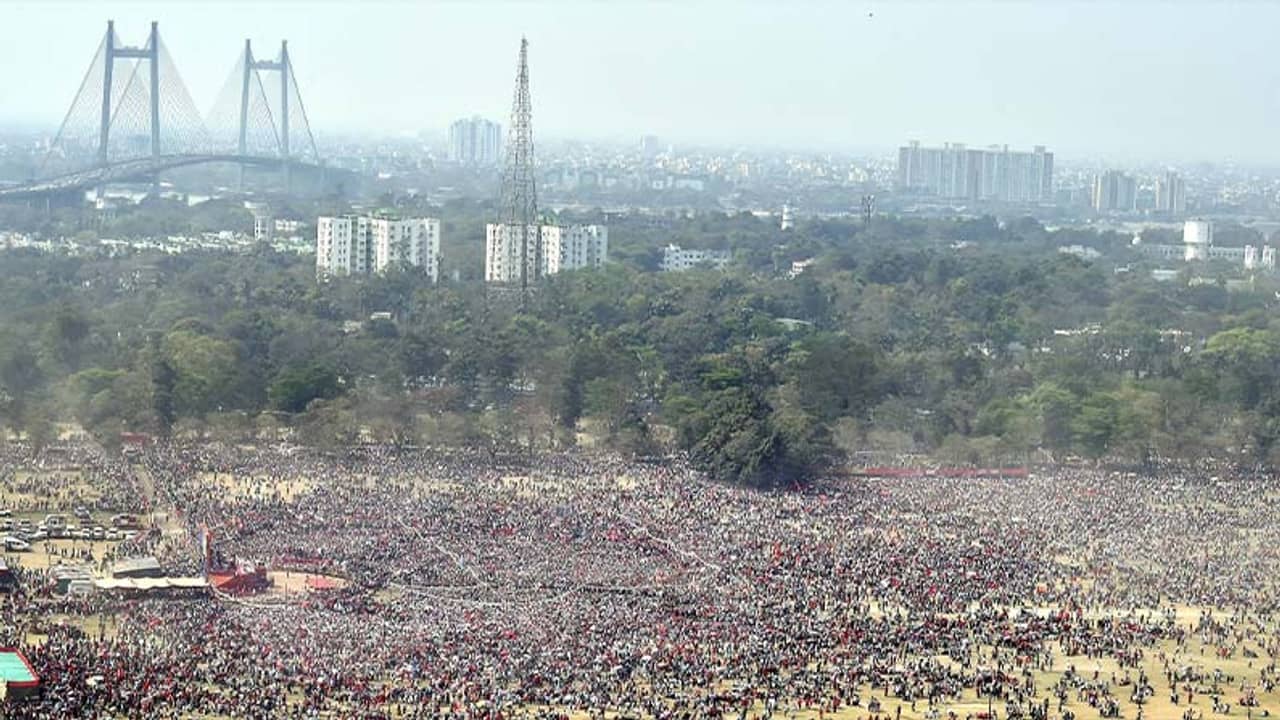 রবিবাসরীয় সব পথ ছিল ব্রিগেডমুখী। জোটের ব্রিগেডে নাচে-গানে-স্লোগানে রঙিন রাজপথ। সূর্য উঠতেই কাঁধে ঝাণ্ডা দিয়ে ব্রিগেডের পথে আম আদমিরা। হাওড়া স্টেশনে ঢাক বাজল। শিয়ালদা স্টেশনে টুম্পা। কেউ কেউ আবার হাতে তুলে নিলেন ডান্ডিয়া। সব মিলিয়ে জমজমাট একুশের নির্বাচনের আগে প্রথম ব্রিগেড।