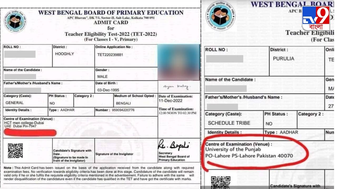 একটি অ্যাডমিটে দেখা যাচ্ছে পরীক্ষার্থীর নাম অয়ন কোলে। তাঁর পরীক্ষাকেন্দ্রের জায়গায় লেখা এইচসিটি কলেজ মেন, দুবাই, নীচে লেখা ইউএই। অর্থাৎ অ্যাডমিট অনুযায়ী দুবাইয়ের ঠিকানায় পরীক্ষা দিতে হবে ওই প্রার্থীকে। আরও একটি অ্যাডমিট কার্ডের ছবিও ভাইরাল হয়েছে। সেখানে পরীক্ষার্থীর নাম রমেশ মুদি। পরীক্ষাকেন্দ্রের জায়গায় লেখা, ইউনিভার্সিটি অব দ্য পাঞ্জাব, লাহোর, পাকিস্তান।