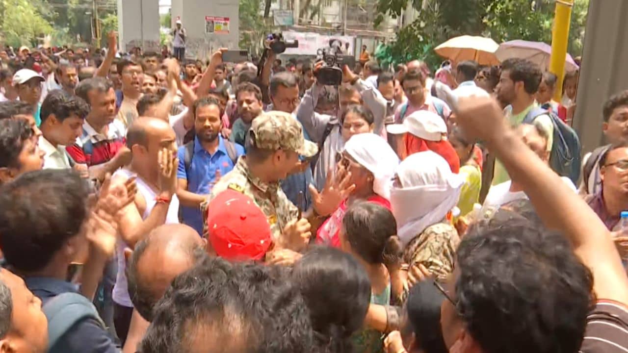 বিধাননগর পুলিশ কমিশনারেটের এক আধিকারিককে চাকরিহারারা বলেন, “আপনি কাকে বাঁচাতে এসেছেন স্যর? আমরা ভাল করে বলছি স্যর ফিরে যান। কাকে বাঁচাতে এসেছেন? আপনি গিয়ে আপনার অফিসারকে জানিয়ে দিন।” যদিও ওই পুলিশ কর্তার বক্তব্য, “আমি বাইরে থেকে ভেতরে ঢুকছি না, আমি দফতরের ভেতরেই ছিলাম। কিন্তু ওনারা আমকে আটকে দিয়েছেন।”