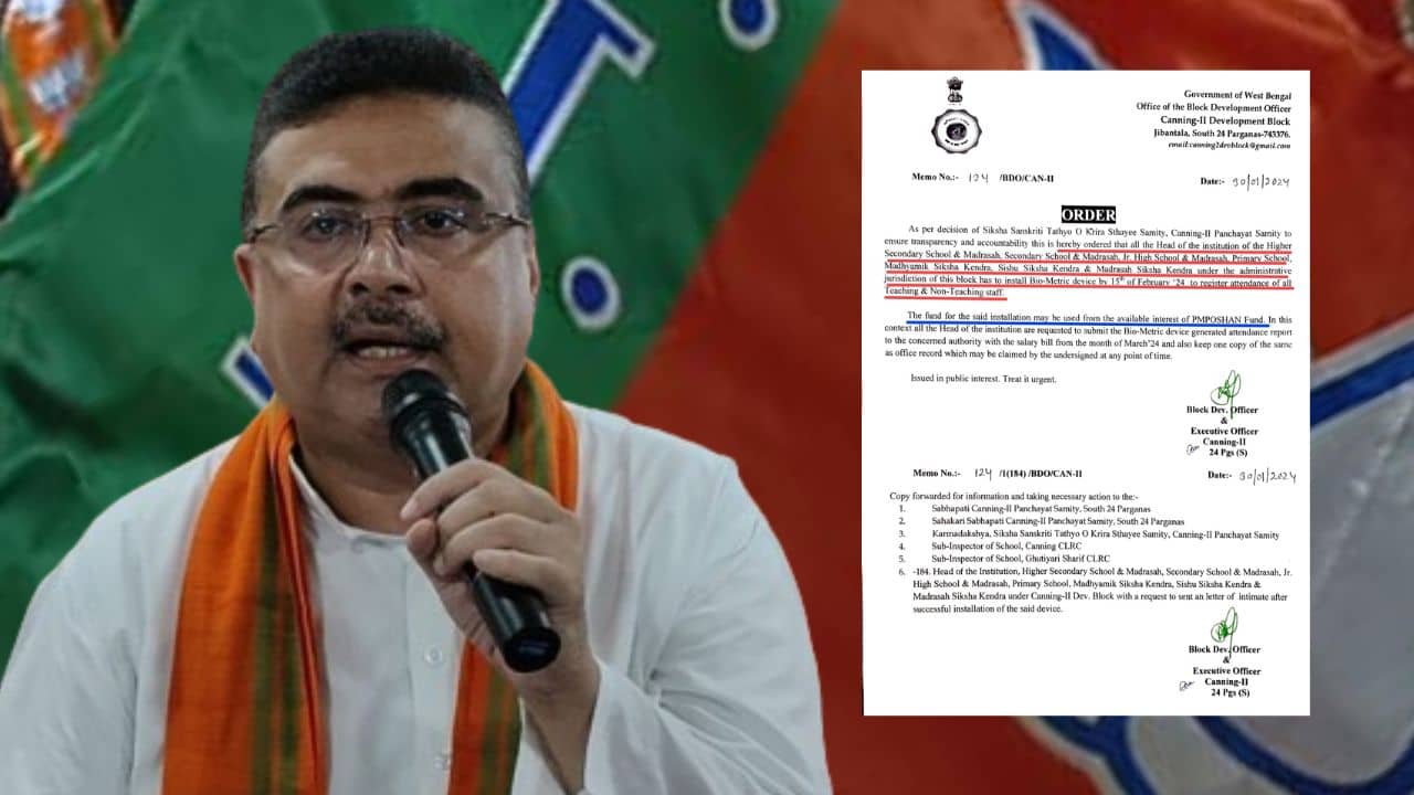 কী অভিযোগ তুলছেন শুভেন্দু? এক্স হ্যান্ডেলে বিরোধী দলনেতা দক্ষিণ চব্বিশ পরগনার ক্যানিং ২ ব্লকের বিডিও-র একটি নির্দেশিকা তুলে ধরেছেন তিনি। শুভেন্দুর অভিযোগ, সেখানে সমস্ত শিক্ষাপ্রতিষ্ঠানগুলির প্রধানদের বলা হয়েছে প্রতিষ্ঠানের শিক্ষক ও অ-শিক্ষক কর্মীদের হাজিরার ক্ষেত্রে বায়োমেট্রিক ডিভাইস বসানোর জন্য। আর এই ডিভাইস বসানোর খরচ, পিএম পোষণ ফান্ডের ইন্টারেস্ট থেকে ব্য়বহার করতে বলা হয়েছে। আর এই নির্দেশিকা নিয়েই আপত্তি শুভেন্দুর।