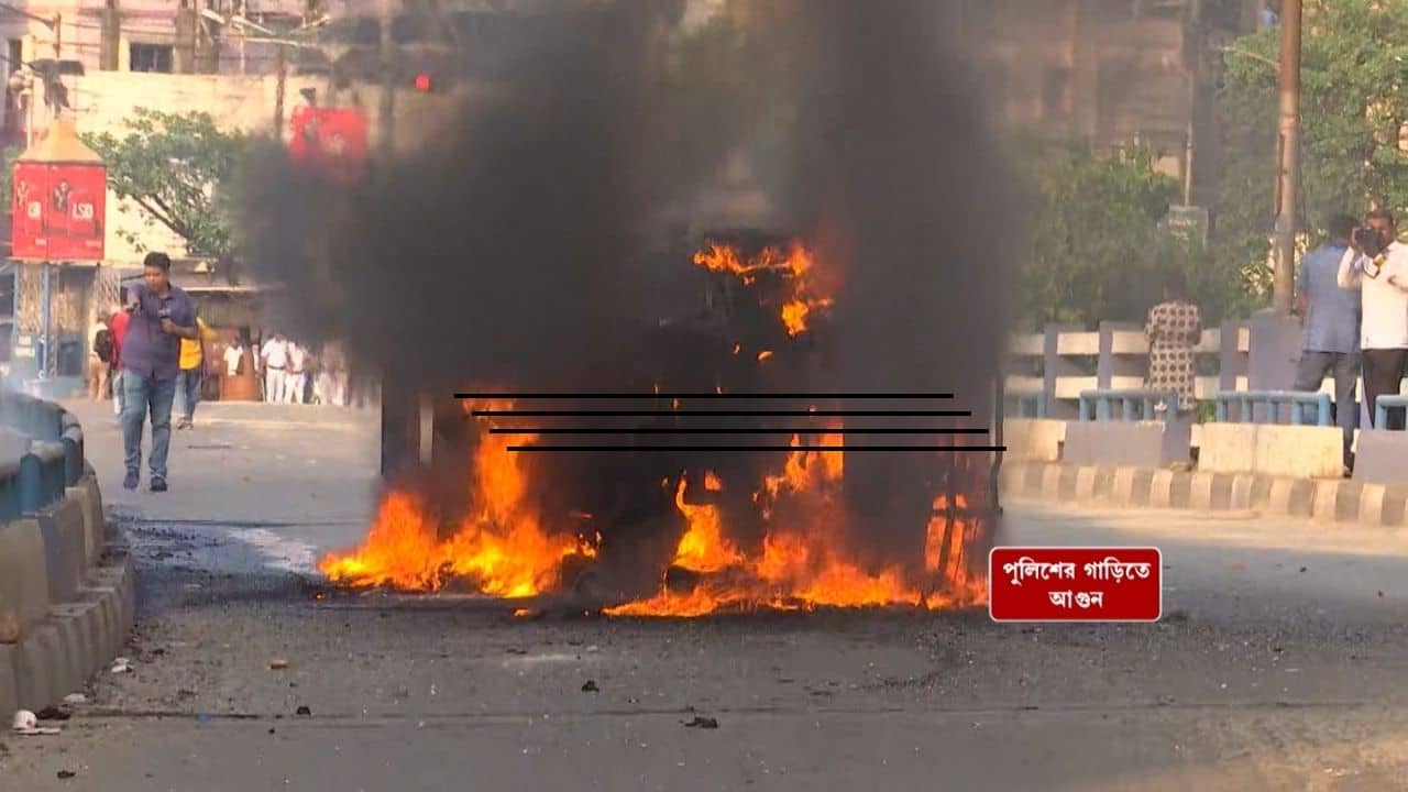 পরিস্থিতি নিয়ন্ত্রণে আনতে গিয়ে টিয়ার গ্যাস ছোড়ে পুলিশ। পুলিশকে লক্ষ্য করে শুরু হয় ইটবৃষ্টি। আগুন ধরিয়ে দেওয়া হয় পুলিশের গাড়িতেও।
