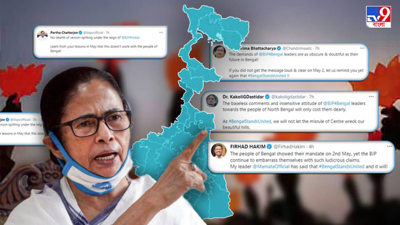 তৃণমূল সাংসদ কাকলি ঘোষ দস্তিদারও টুইট করে লিখেছেন, “উত্তরবঙ্গের মানুষের প্রতি বাংলার বিজেপি নেতাদের ভিত্তিহীন মন্তব্য এবং অসংবেদনশীল মনোভাব তাঁদেরই ক্ষতি করবে। বাংলার একতা বজায় রয়েছে। আমরা কেন্দ্রের অপশাসনকে আমাদের সুন্দর পাহাড়ের ক্ষতি করতে দেব না।” একই সুরে টুইট করেছেন তৃণমূলের বাকি নেতারাও।