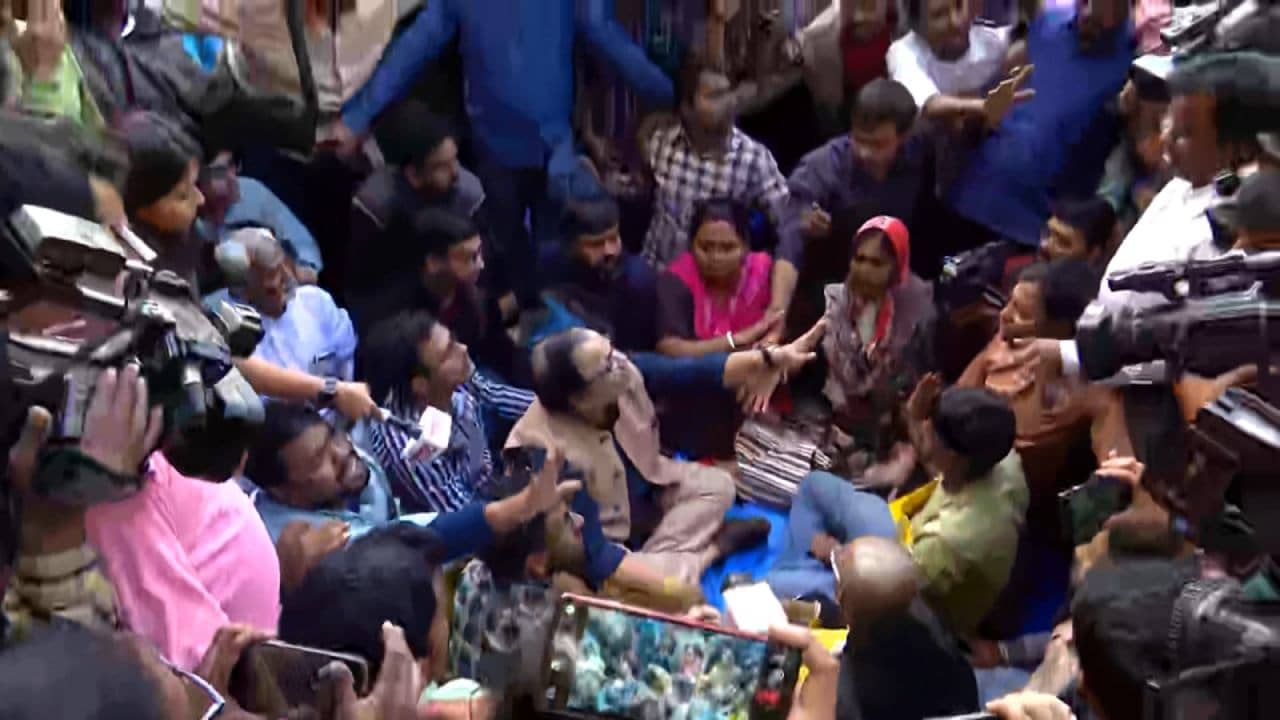 কুণালকে দেখেই ক্ষোভে ফুঁসতে ফুঁসতে কৌস্তভ বলেন, “সরকারি দলের প্রতিনিধিরা এখানে কী নাটক করতে এসেছেন? যদি হিম্মত থাকে তাহলে সরকারের কাউকে নিয়োগপত্র দিয়ে পাঠাক। আসলে একটাই কথা বলতে হবে চোর ধরো আর জেলে ভরো।” এদিকে কুণাল যখন ঢুকছেন তখন মঞ্চে বক্তব্য রাখছেন বিমান বসু। তখনই কুনাল ঘোষকে একেবারে বিমানের মুখোমুখি দাঁড়িয়ে পড়তে দেখা যায়।