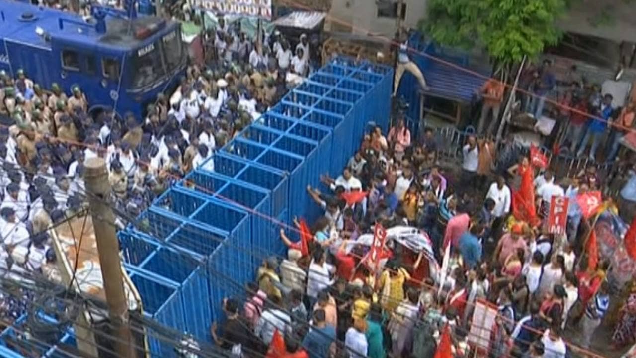 এদিকে বিক্ষোভকারীদের ধাক্কা সামাল দিতে বিবি গাঙ্গুলী স্ট্রিটের ঠিক মাঝখানে দুই মানুষ লম্বা যে গার্ড রেল বসানো হয়েছে সেগুলিকে আবার লোহার চেন দিয়ে বেঁধে ফেলাও হয়েছে। মোতায়েন কয়েকশো পুলিশ। পুলিশে পুলিশে ছয়লাপ লালবাজার মোড়ও।