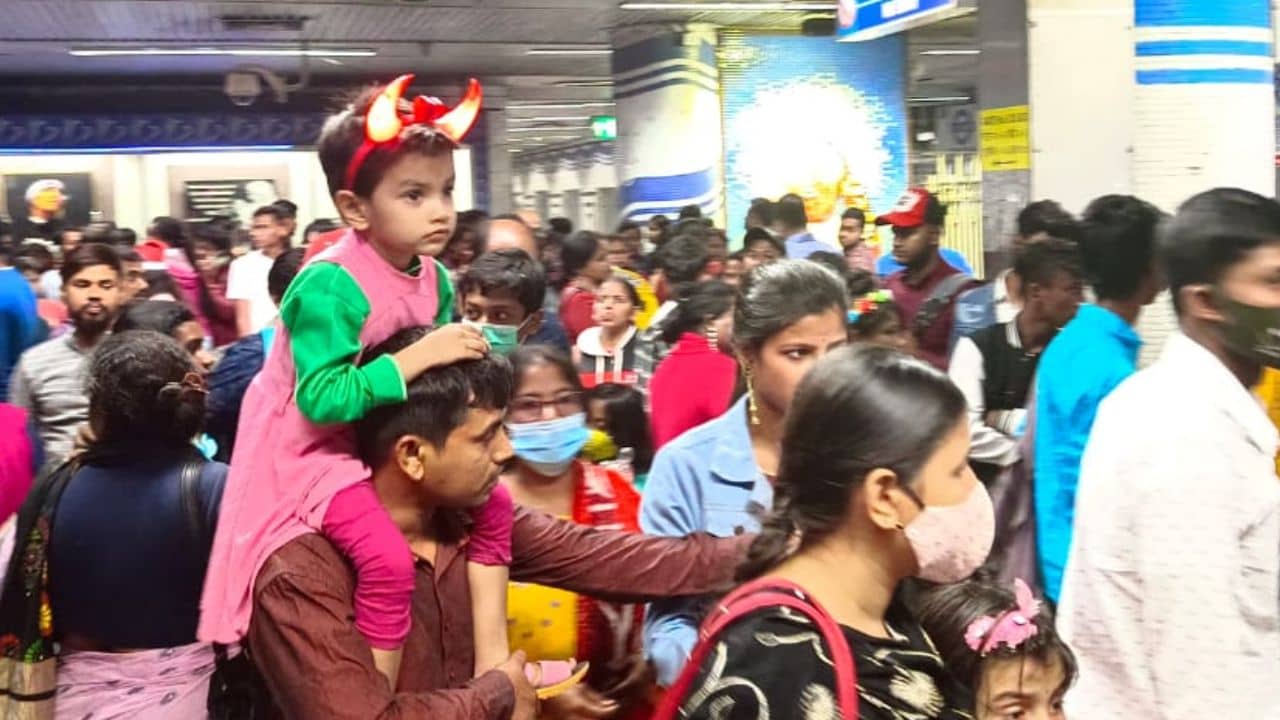 শিশু থেকে প্রবীণ কিংবা বর্তমান প্রজন্ম, মেট্রো স্টেশনগুলিতে শুধুই মানুষের মাথা দেখা গিয়েছে রবিবার। বেলা বাড়ার সঙ্গে সঙ্গে মেট্রোয় যেন ওঠানামা দায় হচ্ছিল। দমদম থেকে কোনওভাবে উঠে পড়লেও মাঝ পথ থেকে যাঁরা মেট্রোয় ওঠেন, বেগ পেতে হয়।