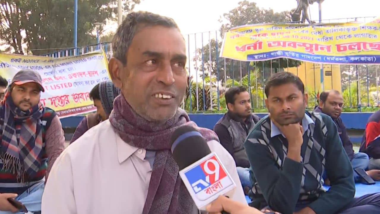 ঘরে ছোট্ট বাচ্চা। দেড় দু’বছর বয়স। নিয়মিত ধর্মতলার ধরনাতলায় (SSC SLST) এসে বসতে পারেন না চাকরিপ্রার্থী রূপা পাল। তাঁর বদলে সপ্তাহে দু’দিন ধর্মতলায় আসেন বাবা গিরিধারী পাল। ৬১ বছর বয়স তাঁর। এই শীতে বীরভূমের সাঁইথিয়া থেকে কলকাতার ধর্মতলায় আসা মোটেই সহজ নয় তাঁর জন্য। কিন্তু মেয়ের লড়াইয়ে কাঁধে কাঁধ মেলাবেন বলেই চলে আসেন নিয়ম করে। সাঁইথিয়ায় ঘড়ির দোকান গিরিধারীবাবুর। নিয়ম করে দোকান খুললে মাসে হাজার পাঁচেক টাকা রোজগার হয়। আপাতত সপ্তাহ দু’দিন দোকান বন্ধ, মাসে আটদিন। তাই রোজগারও কিছুটা কমেছে। তবে মেয়ের জন্য এ ত্যাগে বাবার কোনও আক্ষেপ নেই। গিরিধারী পাল বলেন, “মেয়ের বাচ্চাটার দেড় দু’বছর বয়স। মেয়ে তো আসতে পারে না। তাই আমি এখানে এসে বসি। অনেক আশা নিয়ে বসে আছি। চাকরি হবে কি না জানি না। কিন্তু মেয়ের স্বার্থে আসি।”
