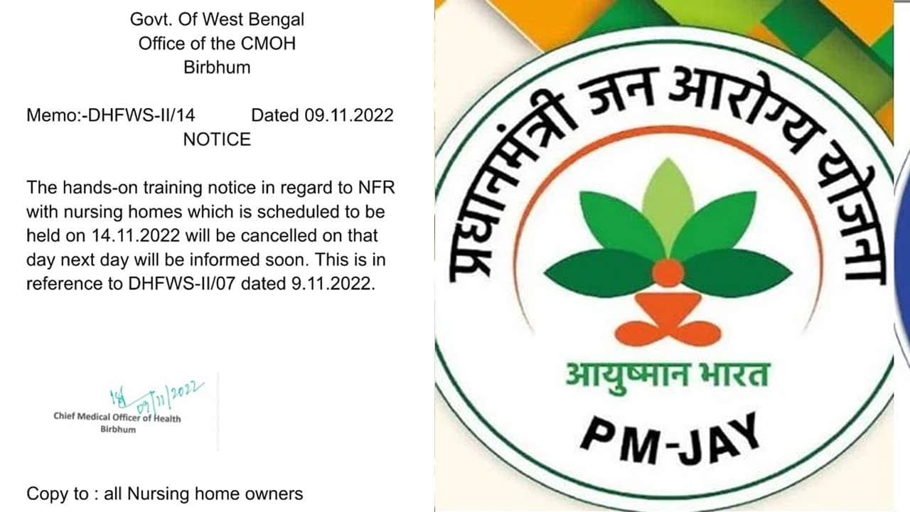 সোমবার বীরভূম জেলায় আয়ুষ্মান ভারত প্রকল্পে সেখানকার নার্সিংহোমগুলিকে জাতীয় হেলথ রেজিস্ট্রারে নাম নথিভুক্ত করার জন্য প্রশিক্ষণ শিবিরের আয়োজন করেছিল জেলা স্বাস্থ্য দফতর। নির্দেশিকার শিরোনাম ছিল, ‘হ্যান্ডস অন ট্রেনিং ফর আয়ুষ্মান ভারত—হেলথ ফেসিলিটি রেজিস্ট্রার’। নির্দেশিকার বয়ান পড়ে বেসরকারি স্বাস্থ্যক্ষেত্রের অন্দরে জল্পনা শুরু হয়ে যায়, তবে কি আয়ুষ্মান ভারত প্রকল্পকে অবশেষে এ রাজ্যেও স্বাগত জানানো হল?