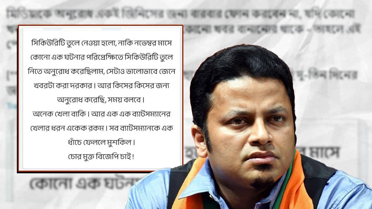 এ প্রসঙ্গেই কার্যত মিডিয়া সম্পর্কে বিরক্তি প্রকাশ করে অনুপম লিখছেন, ‘মিডিয়াকে অনুরোধ, একই জিনিসের জন্য বারবার ফোন করবেন না। যদি কোনও খবর করার থাকে বা মনগড়া মুখরোচক কোনও খবর বানানোর থাকে তাহলে এই পোস্ট দেখে করে নিতে পারেন।’ এরপরই অনুপম একটি ছবি পোস্ট করেন, সেখানে লিখছেন, ‘সিকিউরিটি তুলে নেওয়া হল নাকি নভেম্বর মাসে কোনও এক ঘটনার পরিপ্রেক্ষিতে সিকিউরিটি তুলে নিতে অনুরোধ করেছিলাম সেটা ভালভাবে জেনে খবরটা করা দরকার। আর কিসের জন্য অনুরোধ করছি সময় বলবে। অনেক খেলা বাকি। একেক ব্যাটসম্যানের খেলার ধরন এক একরকম। সব ব্যাটসম্যানকে এক ধাঁচে ফেললে মুশকিল। চোর মুক্ত বিজেপি চাই।’