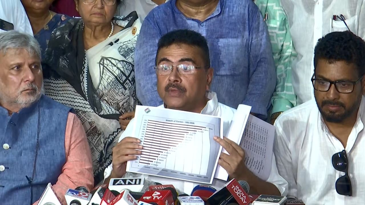 শুভেন্দুর দাবি, শেষ জনগণনায় দেখা যাচ্ছে জাতীয় গড়ের থেকে পশ্চিমবঙ্গের গ্রোথ ১০ শতাংশ বাড়ানো। আর ভোটার তালিকায় ১৬ থেকে ২৫। সাংবাদিক বৈঠকে একেবারে পরিসংখ্যান তুলে ধরে শুভেন্দু বলেন, “জাতীয় গ্রোথ যেখানে ৭ শতাংশ, সেখানে সেখানে ৯টি বাংলাদেশ বর্ডার জেলায় গড় বৃদ্ধি ২০ থেকে ৩০ শতাংশ। ২০১৪ থেকে ২০২৪ মমতার আমলে মেখলিগঞ্জে ২৪.৭৭ শতাংশ বৃদ্ধি। মাথাভাঙায় ২১.৭৯। কোচবিহার উত্তর ১৯.৫৯, কোচবিহার দক্ষিণ ১৯.৭৯, শীতলকুচি ২৪.৬২, দিনহাটা ২৫.৯৩, নাটাবাড়ি, তুফানগঞ্জ. কুমারগ্রামে ২১.১০।”