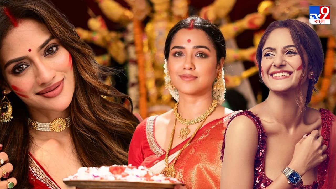 লাল বেনারসি, সোনার গয়না, সিঁদুর, টিপে রাঙা হয়ে মা-কে বরণ করেছেন শুভশ্রী গঙ্গোপাধ্যায়। শুভশ্রীর পুরো সাজ জুড়ে বজায় খাঁটি সাবেকিয়ানা। খোঁপায় জুঁইয়ের মালা শুভশ্রীর সাজে যোগ করেছে অন্য মাত্রা। দশমীকে সাবেকি লাল -পাড় সাদা শাড়ি, সিঁদুরের টিপ খোঁপায় মালায় সেজেছেন সোহিনী সরকার। সুন্দর করে কাজল দিয়ে চোখ এংকেছেন। মেকআপের অতিরিক্ত ঘনঘটা নেই। সোহিনী যেন ঠিক মায়েরই এক প্রতিরূপ। বড়ই মায়াবী লাগছে তাঁকে দশমীর এই সাজে। সাবেকি আর আধুনিকতার মেলবন্ধন ঘটেছে নুসরত জাহানের সাজে। বেনারসির কাজের ফুলস্লিভ লাল ব্লাউজের সঙ্গে লাল পাড় আর সাদা ঢাকাইয়ের কম্বিনেশনের একটি লেহঙ্গা চোলি পরেছেন নুসরত। কপালে সিঁদুরের টিপ, গলায় চোকার, হাতে শাঁখা-পলা, বালা সবই রয়েছে। সাবেকি প্রথম মেনে হাতে আলতাও পরেছেন নুসরত। খোলা চুলে ব্যাক ব্রাশ করে ব্লো ডাই করেছেন।