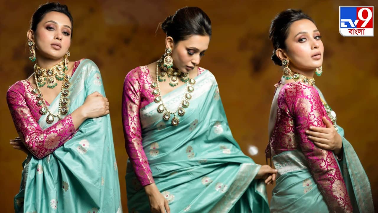 একপ্লিট করেই শাড়িটি পরেছেন মিমি। কুঁচি, আঁচলে একই রকম কাজ রয়েছে। মিমির শরীরে কোথাও অতিরিক্ত মেদ নেই। মিষ্টি খেতে খুবই ভালবাসেন ফিটনেস ফ্রিক মিমি। আর তাই কোনওদিন দুটি মিষ্টি বেশি খেলেই একটানা ওয়ার্কআউট করেন। মিমির হাইট, শরীরী গঠনে শাড়িটি ভীষণভাবে তাঁর সঙ্গে জড়িয়ে রয়েছে। যে কারণে দেখতে আরও অপূর্ব লাগছে। এই শাড়ির সঙ্গে সবুজ কুন্দনের গয়না পরেছেন যা শাড়িটিকে আরও বেশি কমপ্লিট করেছে। ভারী কুন্দনের গয়না, কানের দুল, চুলের খোঁপা সব মিলিয়ে খুব সুন্দর লাগছে তাঁকে। যে কোনও পুজো বা বিশেষ অনুষ্ঠানে এমন ভাবে সাজলে যে কোনও কাউকে খুব সুন্দর লাগে দেখতে। মিতান ঘোষের কালেকশন থেকে এই সুন্দর বেনারসিটি বেছে নিয়েছেন মিমি। তাঁর স্টাইলিং করেছেন অভিষেক রায়। মিমির টিমই তাঁকে সুন্দর করে সাজিয়েছেন।