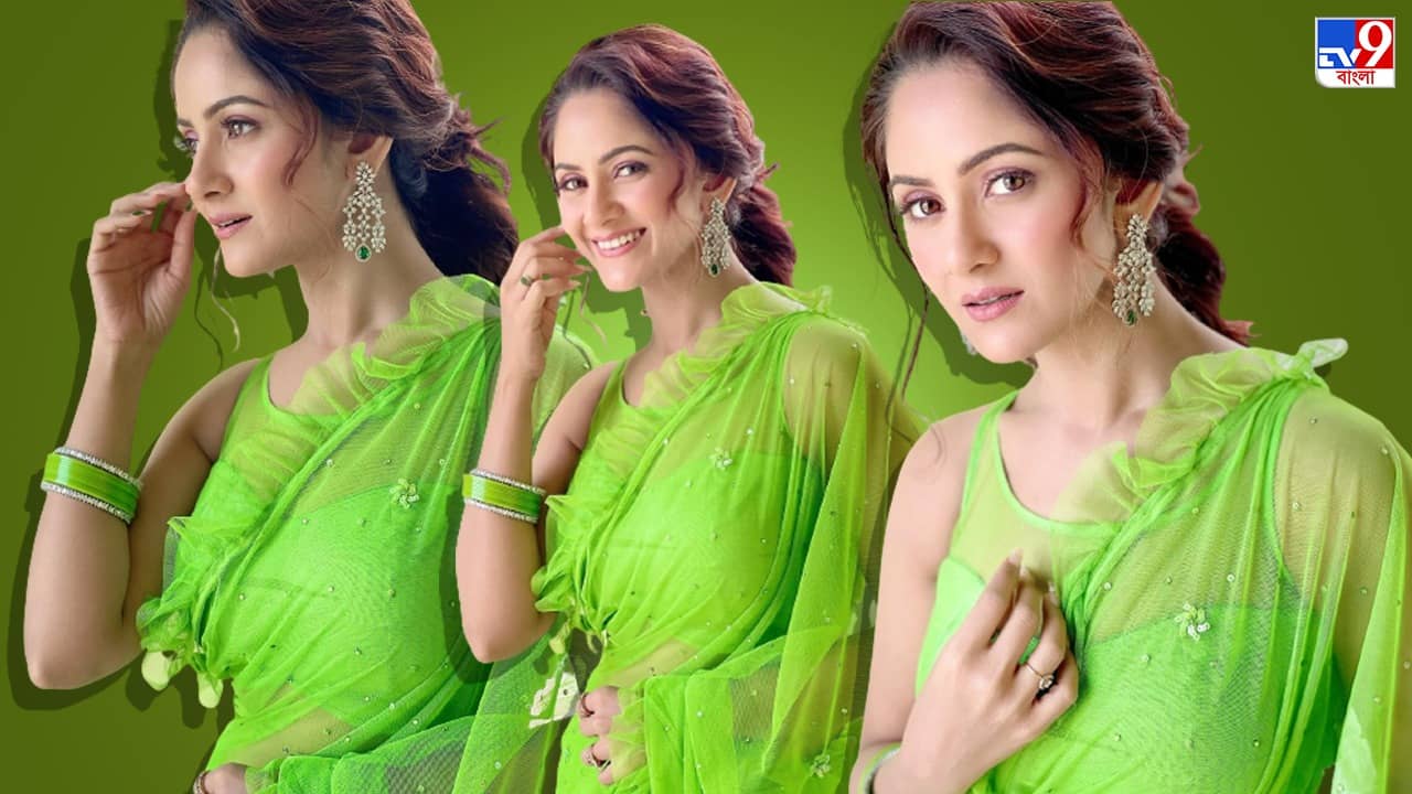 এই সবুজ রং দেখতে খুবই ভাল লাগে। আর এই সবুজ রঙের সি থ্রু রাফেল শাড়িটি দারুণ ভাবে পরেছেন তৃণা। শাড়িতে ছোট ছোট চুমকির কাজও রয়েছে। এক রঙা কো-অর্ড এই শাড়িটির আলাদা কোনও বর্ডার নেই। শাড়িতে ছোট ছোট ফুলের মোটিফ রয়েছে। শাড়িটির সঙ্গে সবুজ রঙের স্লিভলেস ব্লাউজ পরেছেন তিনি। হাতে সবুজ রঙের কাঁচের চুড়ি আর স্টোনের চুড়ি একসঙ্গে পরেছেন। একহাতেই পরেছেন এই চুড়ির গাছা। কানে আমেরিকান ডায়মণ্ডের স্টোনের দুল পরেছেন। চুলে ব্যাকব্রাশ করে চুল বেঁধেছেন। অতিরিক্ত কোনও মেকআপ তিনি করেননি। এতেই তৃণাকে লাগছে উজ্জ্বল। তাঁর থেকে চোখ ফেরানো দায়।