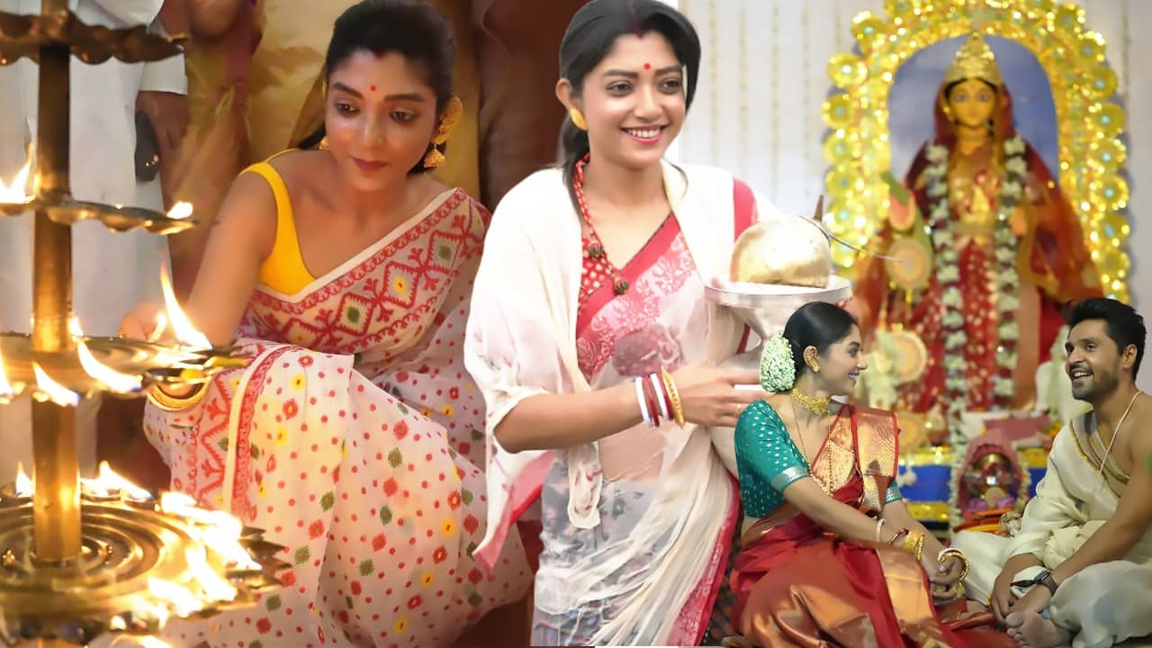 মঙ্গলঘট স্থাপনের সময় তাঁকে দেখা গেল সাবেকি লাল পাড় সাদা শাড়িতে। ডুব নিয়ে কাঁখে কলসি নিয়ে দাঁড়িয়ে দেবলীনা দারুণ একটি ছবি শেয়ার করেছেন। আর এখানে তাঁকে লাগছে সাক্ষাৎ অন্নপূর্ণা। পুজোর দিনে লাল শাড়ি, সোনার গয়না, খোঁপায় জুঁই এর মালা দিয়ে খুব সুন্দর করে সেজেছেন দেবলীনা। সব মিলিয়ে প্রতিটা সাজেই দেবলীনাকে দেখতে লাগছে খুব সুন্দর। আপনিও চোখ ফেরাতে পারছেন কি?