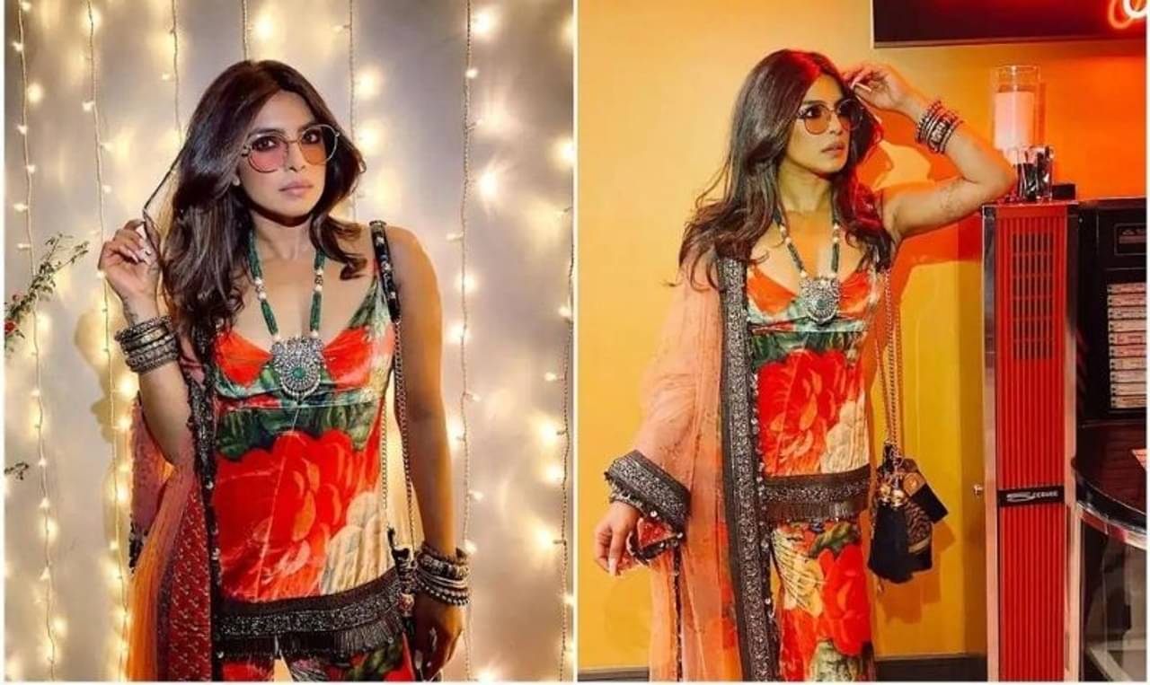 এর আগে নিজের বিলাসবহুল বাড়িতে দিওয়ালির অনুষ্ঠানে স্বামী নিক জোনাসের সঙ্গে সাদা লেহেঙায় অসাধারণ সব ছবি পোস্ট করেছিলেন। এবার লিলি সিংহের পার্টির জন্য কমলা ও সবুজ রঙের শেডে ফ্লোরাল প্যাটার্নে সজ্জিত মখমলের কাপড়ের একটি স্লিভলেস শর্ট কুর্তি পরেছেন। সঙ্গে নিয়েছেন একটি গোটাপট্টি। অসাধারণ দেখতে কুর্তির সঙ্গে একই ফেব্রিকের শারারা প্যান্ট বেছে নিয়েছিলেন। পাড়ে এমব্রয়াডারির কাজ ও জরির একটি দোপাট্টা দীপাবলির লুক সম্পূর্ণ হয়েছিল।