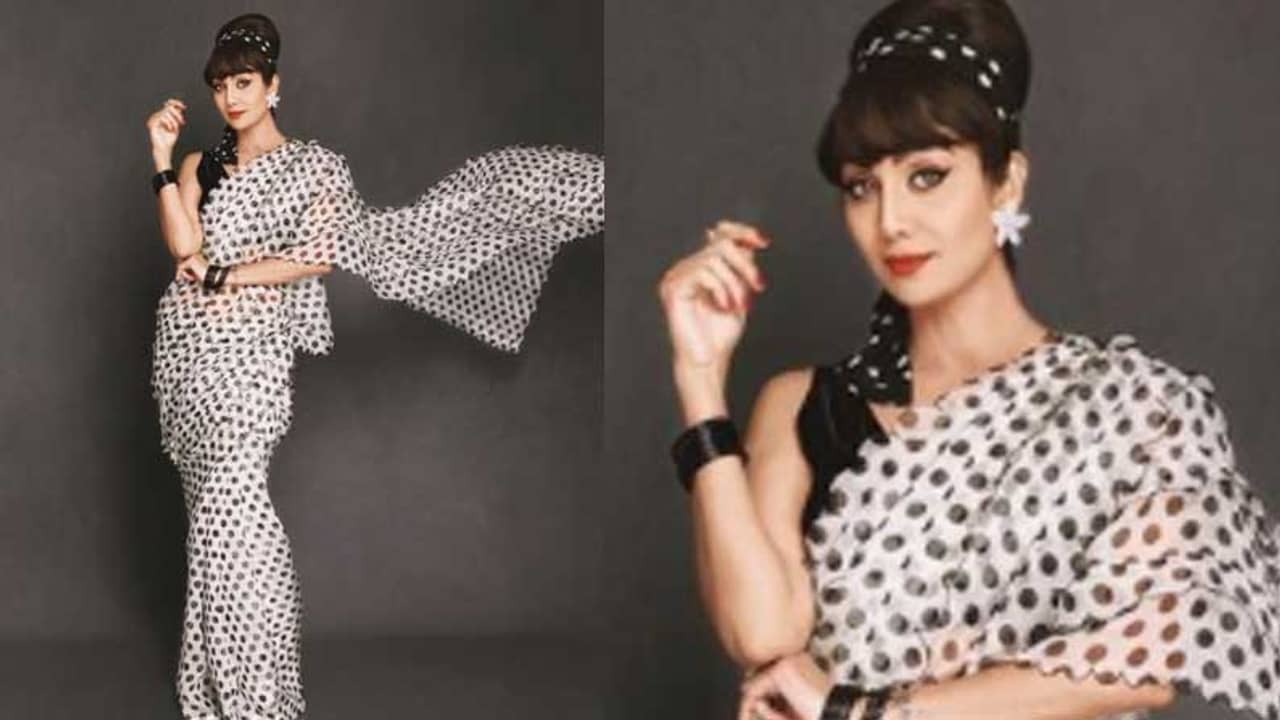 ববি প্রিন্টের শাড়ি। আঁচল উড়ছে হাওয়ায়। উঁচু করে বাঁধা চুল। শাড়িতে সাদার উপর কালো রঙের প্রিন্ট। আর মাথার ব্যান্ডে ঠিক উল্টো। কালোর উপর সাদা। দু হাতে কালো কাচের চুড়ি। কালো স্লিভলেস ব্লাউজ অন্য রকম আভিজাত্যের সংজ্ঞা বহন করছে। লাল লিপস্টিক আর টানা আইলাইনারের সাজে মেকআপ কমপ্লিট।
