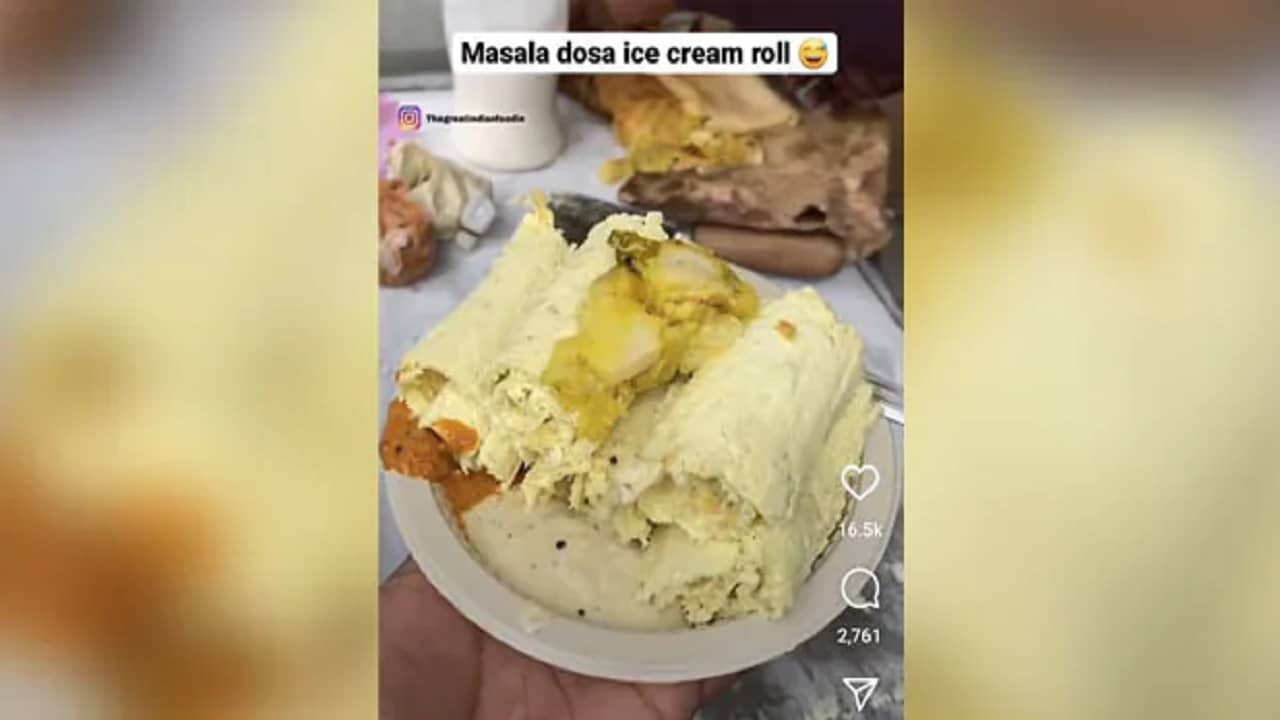 দিল্লির একটি দোকানে বানানো হচ্ছে মশলা ধোসা আইসক্রিম। একেবারে সম্পূর্ণ ভিন্নধর্মী দুটি খাবার। এই দুটি খাবার একসঙ্গে মিলিয়ে মিশিয়েই তৈরি হচ্ছে ধোসা আইসক্রিম রোল। মশলা ধোসা তৈরি করে তার সঙ্গে ক্রিম মিশিয়ে তৈরি হচ্ছে আইসক্রিম। উপরে টপিংস হিসেবে থাকছে আলুর পুর। সাথে নারকেলের চাটনি ফ্রি। @thegreatindianfoodie- এর তরফে ইন্টাগ্রামে আপলোড করা হয়েছে এই ভিডিয়ো। এখনও পর্যন্ত প্রায় ১১ লক্ষ মানুষ সেই ভিডিয়ো দেখেছেন। লাইক ১৬ হাজার এবং কমেন্টস এসেছে ২৭২০। তবে বেশিরভাগ মানুষ এই ভিডিয়ো দেখে ক্ষুব্ধ। লকডাউনের সময় থেকেই খাবার নিয়ে চলছে নানা রকম পরীক্ষা-নিরীক্ষা। সেই পরীক্ষা এখন চূড়ান্ত পর্যায়ে পৌঁছে গিয়েছে. গত বছর থেকেই অগ্নিপরীক্ষা চলছে ম্যাগি, ফুচকার। ম্যাগির সঙ্গে চকোলেট, রুহ আফজা মিলেমিশে একাকার। এবার পালা আইসক্রিমের।