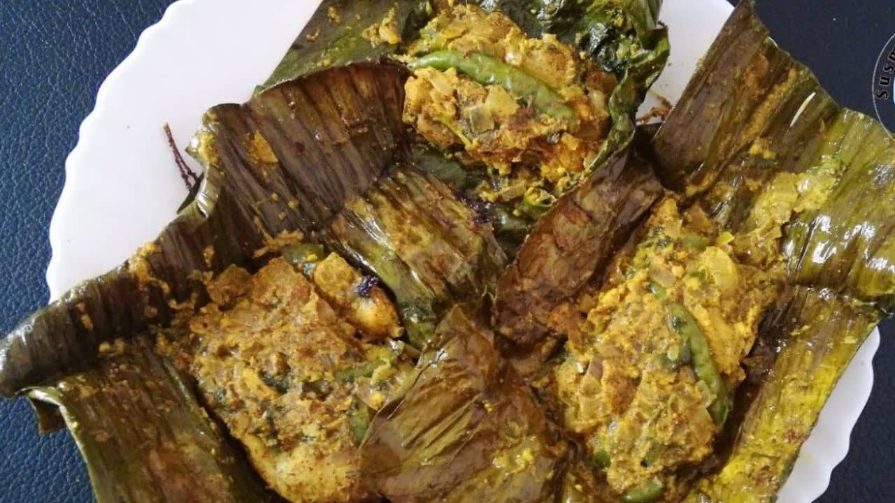 মাছ ছোটো ছোটো করে কেটে গরম জলে ধুয়ে নিন। কড়াইতে তেল গরম করে পেঁয়াজকুচি, রসুন থেঁতো করে দিন। একটু নাড়াচাড়া করে মাছ কড়াইতে দিন। অল্প ভাজা ভাজা হলে লঙ্কাবাটা, নুন, হলুদ দিয়ে ভালো করে ভেজে নিন। অল্প জল দিয়ে ফুটতে দিন। গা-মাখামাখা হলে থালায় ঠান্ডা হতে দিন। এক-একটি পাতায় এই মাছের মিশ্রণ রেখে চারপাশ থেকে পাতাটি মুড়ে দিন। চালবাটার মধ্যে ডুবিয়ে কড়াইতে তেল গরম করে ভেজে নিন।
