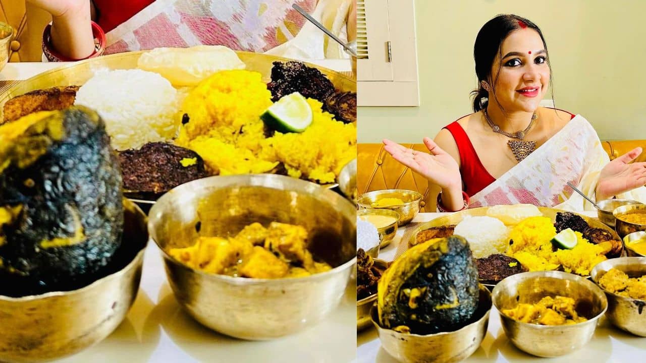 পঞ্চ-ব্যঞ্জন রান্না করে খাওয়ানো হয়েছে শুভশ্রীকে। মাছের মাথা থেকে শুরু করে পোলাও, মাছ খেলেন জমিয়ে।