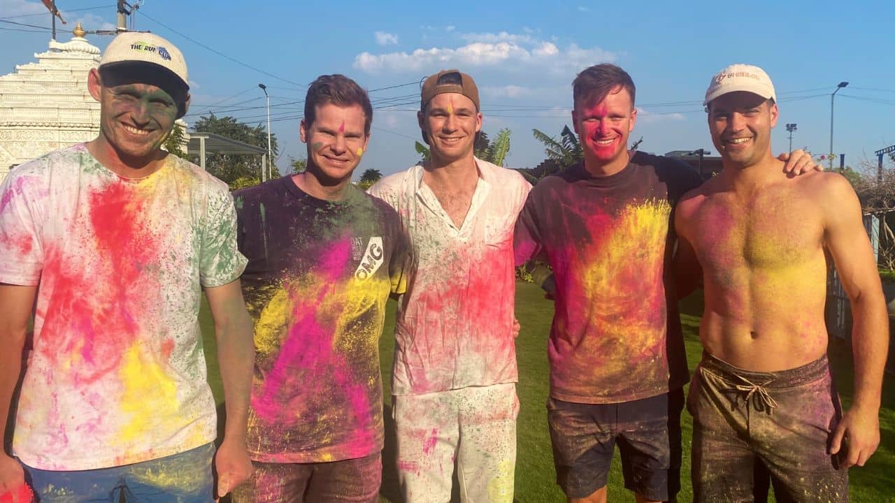 স্টিভ স্মিথ, ম্যাট কুহনেম্যান, অ্যালেক্স ক্যারি ও পিটার হ্যান্ডসকম্বের সঙ্গে জমিয়ে হোলিতে মজা করেছেন মার্নাস লাবুশেন। (Pic Courtesy - Marnus Labuschagne Instagram)