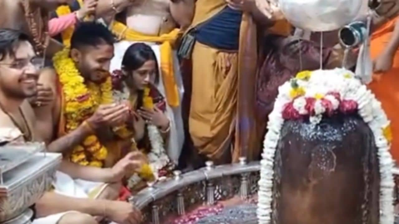 বিয়ের পর স্ত্রীর সঙ্গে মহাকালেশ্বর মন্দিরে এসে অক্ষরের ভস্ম আরতিতে অংশ নেওয়ার ইচ্ছেও পূরণ হয়েছে। যার ফলে তিনি বেশ খুশি। (ছবি-টুইটার)