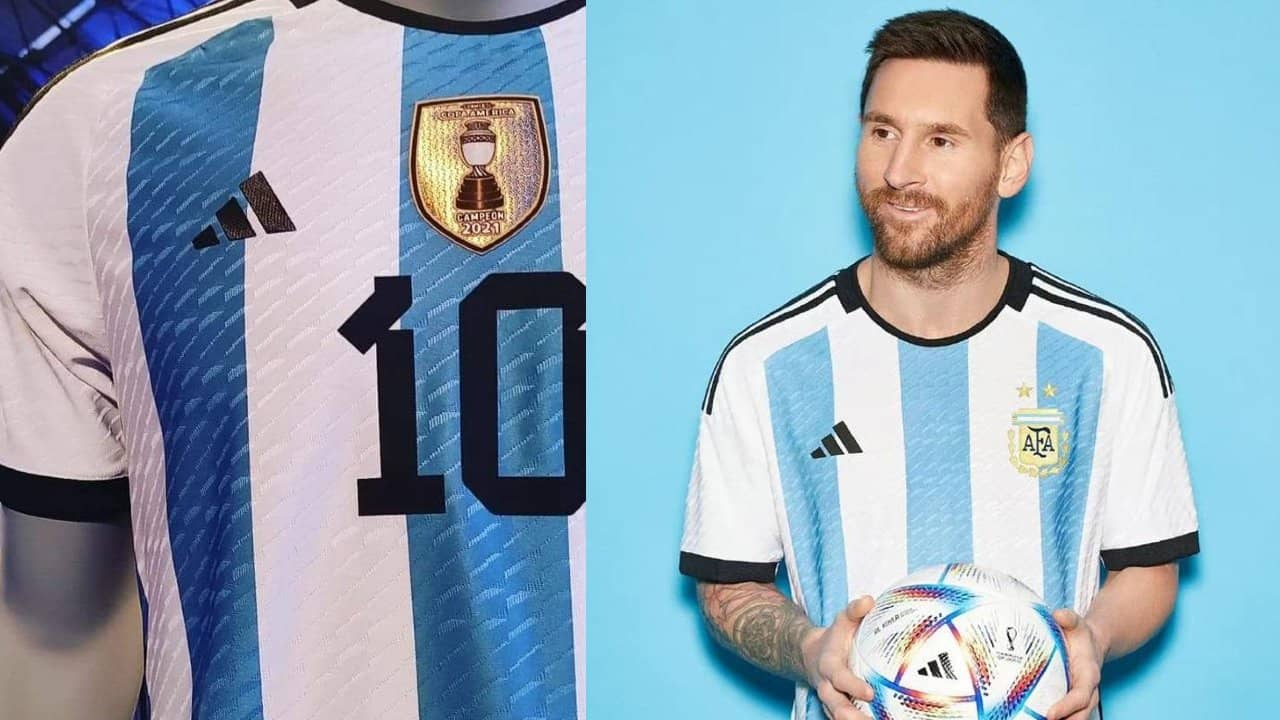 প্রথম দল হিসেবে ২০২২ ফুটবল বিশ্বকাপের জার্সি প্রকাশ্যে আনল মেসির দেশ। আর্জেন্টিনার অফিশিয়াল টুইটার অ্যাকাউন্ট থেকে অধিনায়ক লিওনেল মেসির গায়ে নতুন জার্সি চড়িয়ে ছবি পোস্ট করা হয়। (ছবি:টুইটার)