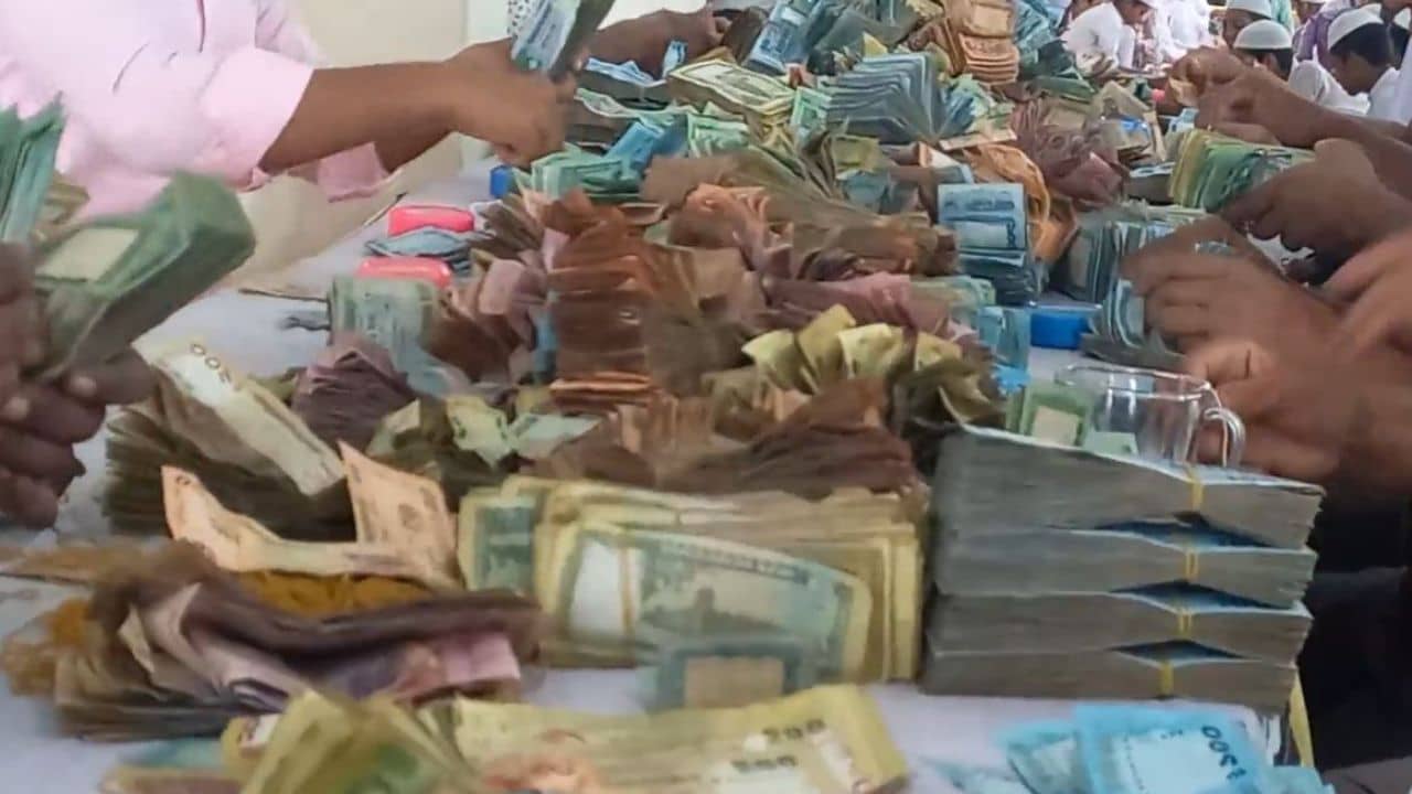 বান্ডিল বান্ডিল টাকা। টেবিলে থরে থরে সাজানো। মাটিতেও পড়ে রয়েছে গুচ্ছ গুচ্ছ টাকা। সবাই বসে গুনছেন সেই টাকা। এমন দৃশ্য দেখেছেন কখনও?