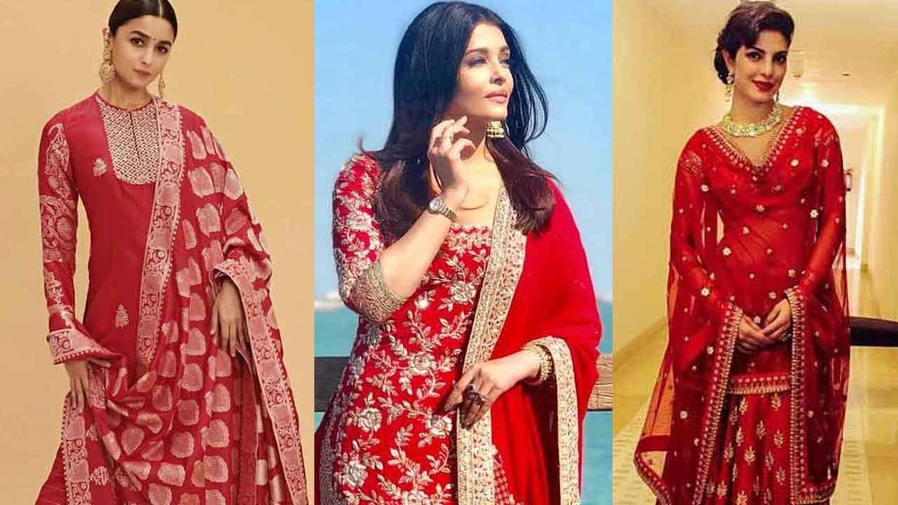 মনীশ মালহোত্রার ডিজাইনার লাল সারারা পরেছেন ঐশ্বর্যা। গোল্ড এমব্রয়ডারি কুর্তা, ভারী কাজের ওড়না। হালকা জুয়েলারি এবং মানানসই মেকআপ বেছে নিতে পারেন নায়িকার মতোই।