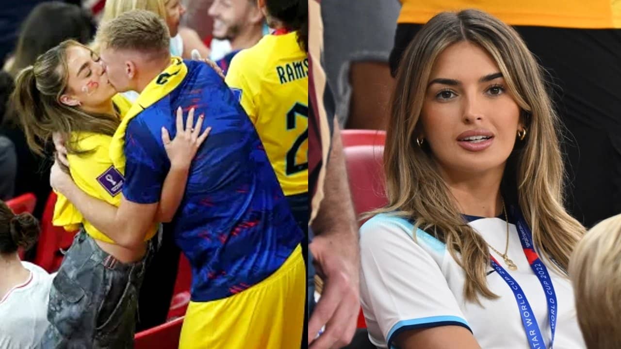 ২২ বছরের ফিল ফডেন বিশ্বকাপের প্রথম ম্যাচেই গোল পেয়েছেন। শেষ ষোলো নিশ্চিত হওয়ার পর গ্যালারিতে বান্ধবী রেবেকা কুকের উষ্ণ আলিঙ্গনে ফডেন। (ছবি:টুইটার)