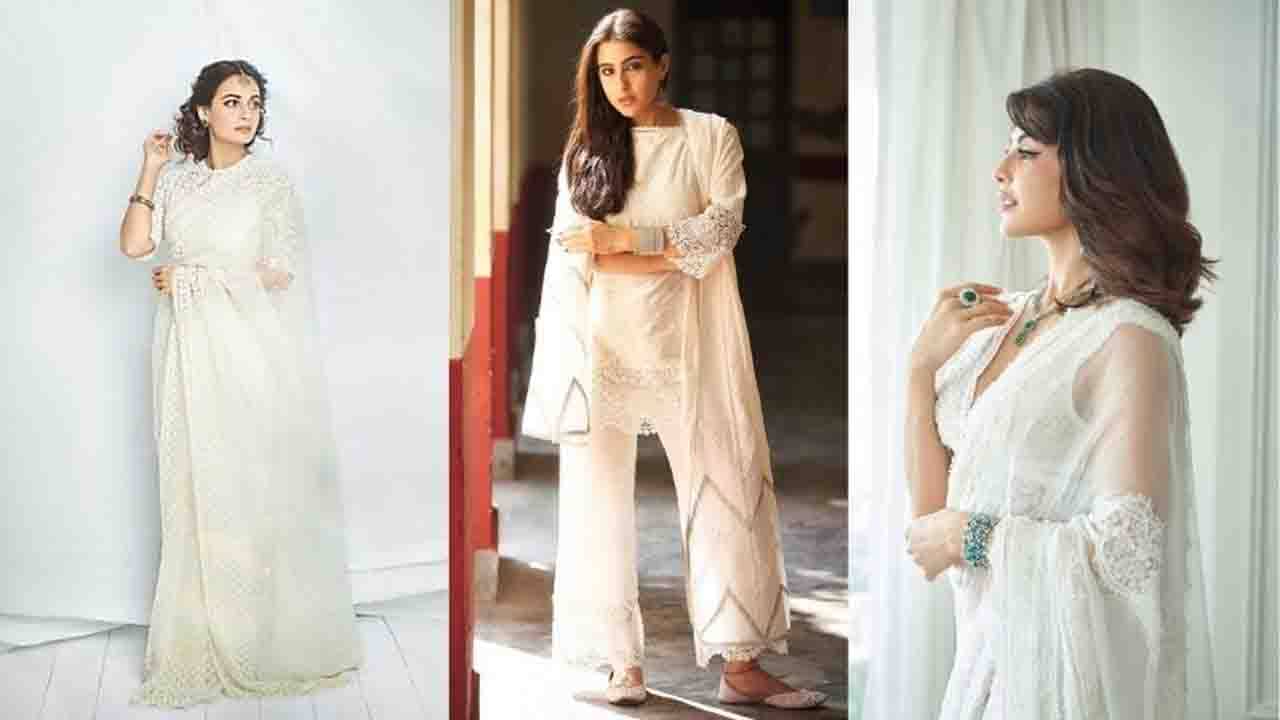 সাদা শাড়ির সঙ্গে লেস দেওয়া ব্লাউজ আপনার নজর কাড়তে বাধ্য। এর অনুপ্রেরণা পাবেন আপনি জ্যাকলিনের কাছ থেকে। এর সঙ্গে জ্যাকলিন পরেছেন সবুজ ডায়মন্ডের সেট।