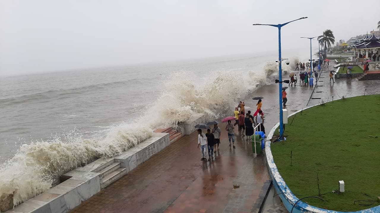 লাগাতার বৃষ্টির সঙ্গে সমুদ্রের ধারে বইছে দমকা বাতাস। ভোরে জোয়ার আসার সঙ্গে সঙ্গে জলোচ্ছ্বাস বেড়ে যায় আরও। সমুদ্রের জল ঢুকে পড়ে সৈকত সরণিতে। সমুদ্রের ধারে বসেই গা ভিজিয়ে নিচ্ছেন পর্যটকেরা।