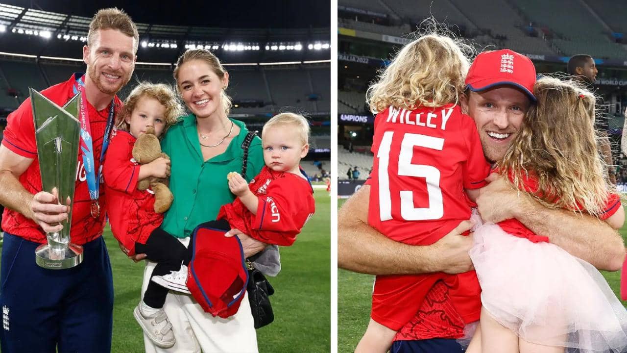 ইংল্যান্ডের তারকা ক্রিকেটার ডেভিড উইলি তাঁর দুই মেয়েকে কাছে টেনে নেন। দলের প্লেয়ারদের সঙ্গে ওই দুই খুদেও সামিল হয় টি২০ বিশ্বকাপ জয়ের সেলিব্রেশনে। (ছবি-টুইটার)