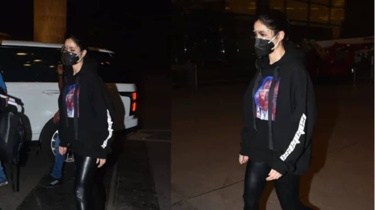 দিন রাতে মুম্বই বিমানবন্দরে প্রবেশ করার মুখে অভিনেত্রীকে কালো টি-শার্টের উপর কালো ওভার সাইজ জ্যাকেট সঙ্গে কালো লেদারের প্যান্ট এবং কালো ব্যুট পরে দেখা গেছে। (ছবি সৌজন্যে হিন্দুস্তান টাইমস)