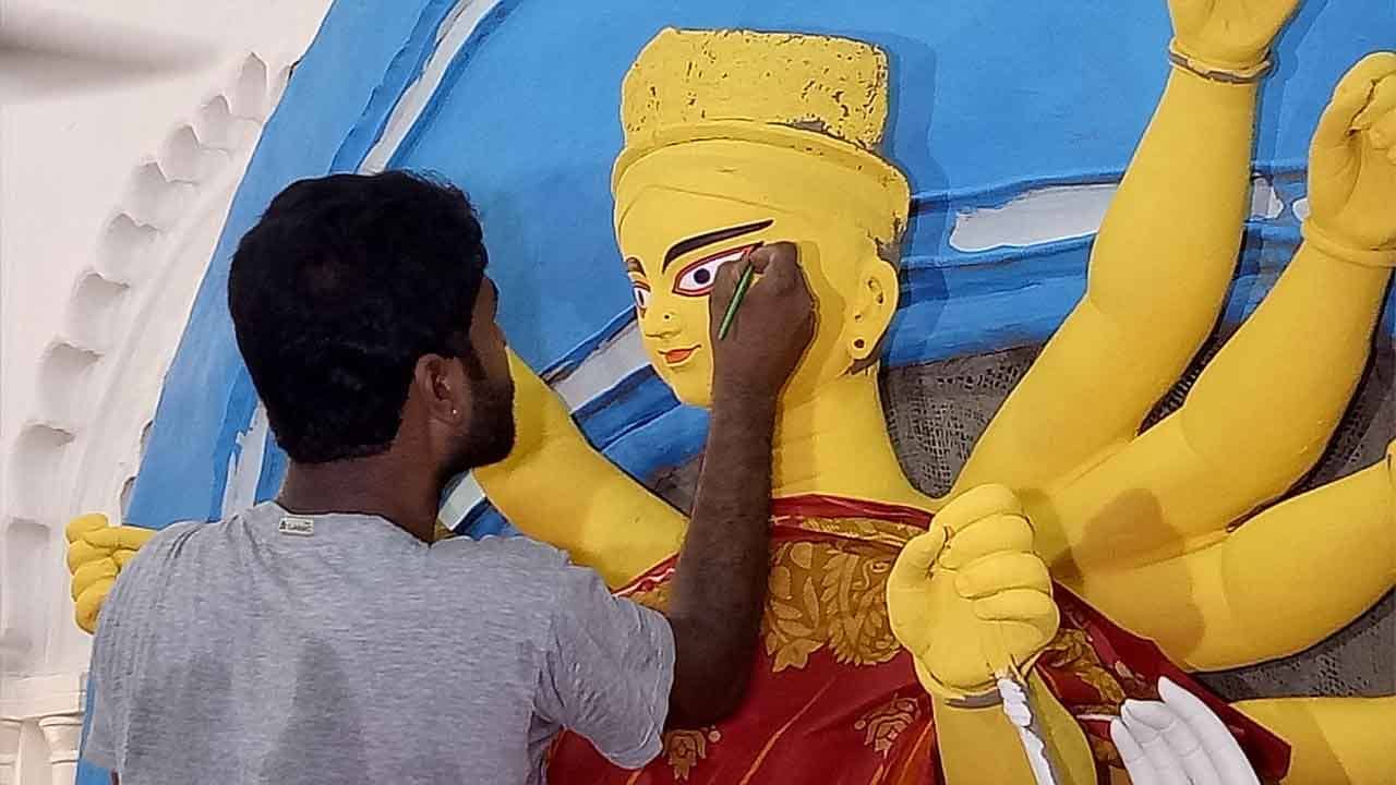 অনুষ্ঠানের শুরুতেই জ্বলে ওঠে বাতি। শুরু হয় চক্ষুদান। এই বাড়ির প্রথা অনুযায়ী, প্রথমে মায়ের বাঁ চোখ আঁকা হয়।(ছবি- অর্ঘ চট্টোপাধ্যায়)