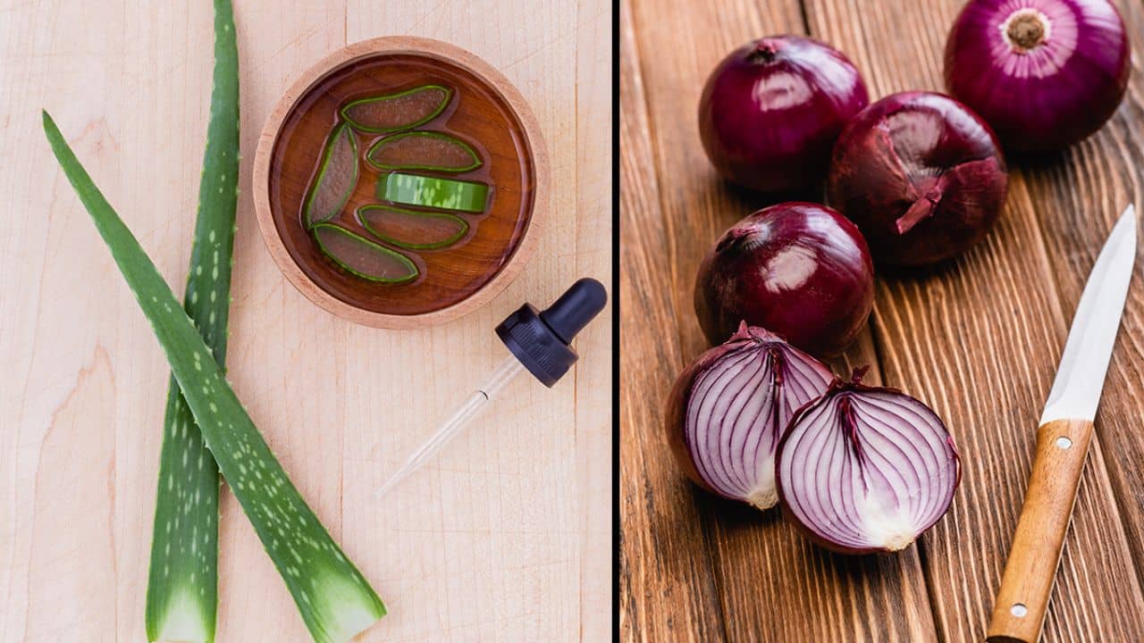 ২ থেকে ৩ চামচ পেঁয়াজের রস নিন। এতে এক টেবিল চামচ অ্যালোভেরা জেল দিন। এবার এটিকে ভাল করে ধুয়ে মাথায় লাগিয়ে ১ ঘণ্টা মত রাখুন। এর পর হালকা শ্যাম্পু দিয়ে পরিষ্কার করুন। সপ্তাহে এক বা দুইবার এই পেস্ট ব্যবহার করলে চুল মজবুত ও সুন্দর হবে।