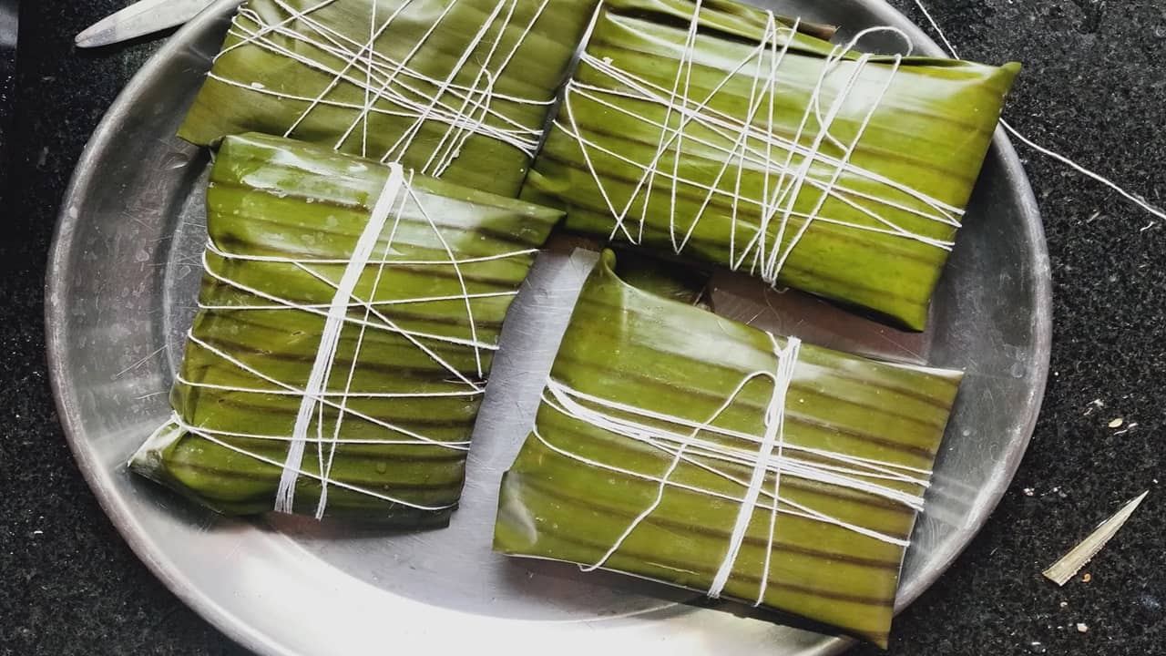 এবার উপর থেকে কয়েক ফোঁটা সর্ষের তেল ছড়িয়ে দিন। তাতে স্বাদ ভাল আসে। এবার কলাপাতা মুড়ে টুথপিক দিয়ে আটকে নিন। চাইলে সুঁতো দিয়ে বেঁধেও দিতে পারেন।
