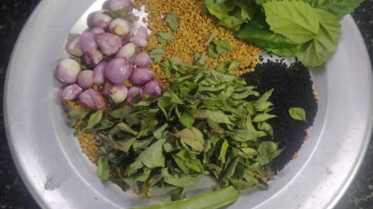 কারিপাতা লাগবে এক বাটি। ১৫০ গ্রাম নারকেল তেলে ১০০ গ্রাম সরষের তেল মিশিয়ে দিতে হবে। তেল ভাল করে গরম হলে কালোজিরে আর মেথি দিতে হবে আড়াই চামচ। দু বাটি কারিপাতা দিন