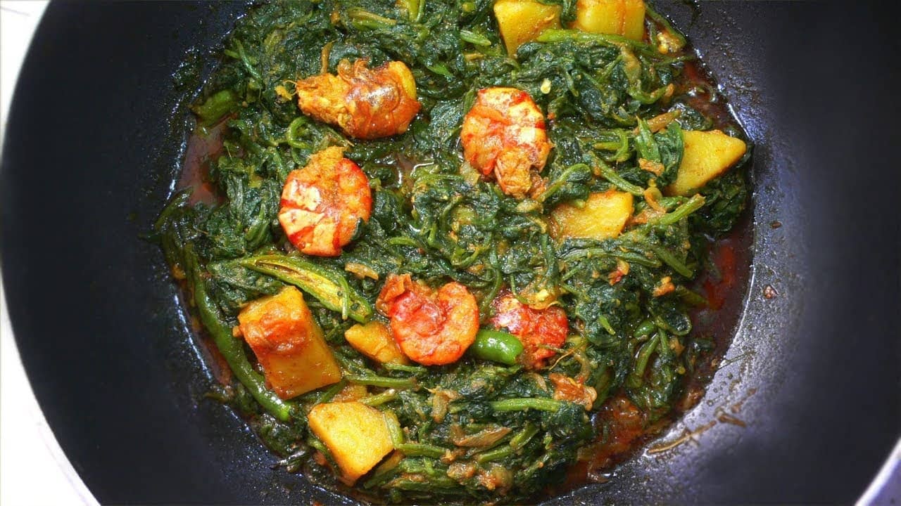 ২৫০ গ্রাম চিংড়ি নিন। মাঝারি মাপের নিলেই চলবে। চিংড়ি আগে থেকে ধুয়ে নুন মাখিয়ে রাখুন। এবার তা মশলার সঙ্গে কষিয়ে নিন। সামান্য জল দিন। চিংড়িতে খয়েরি রং ধরলে পালং শাক দিয়ে দিন।