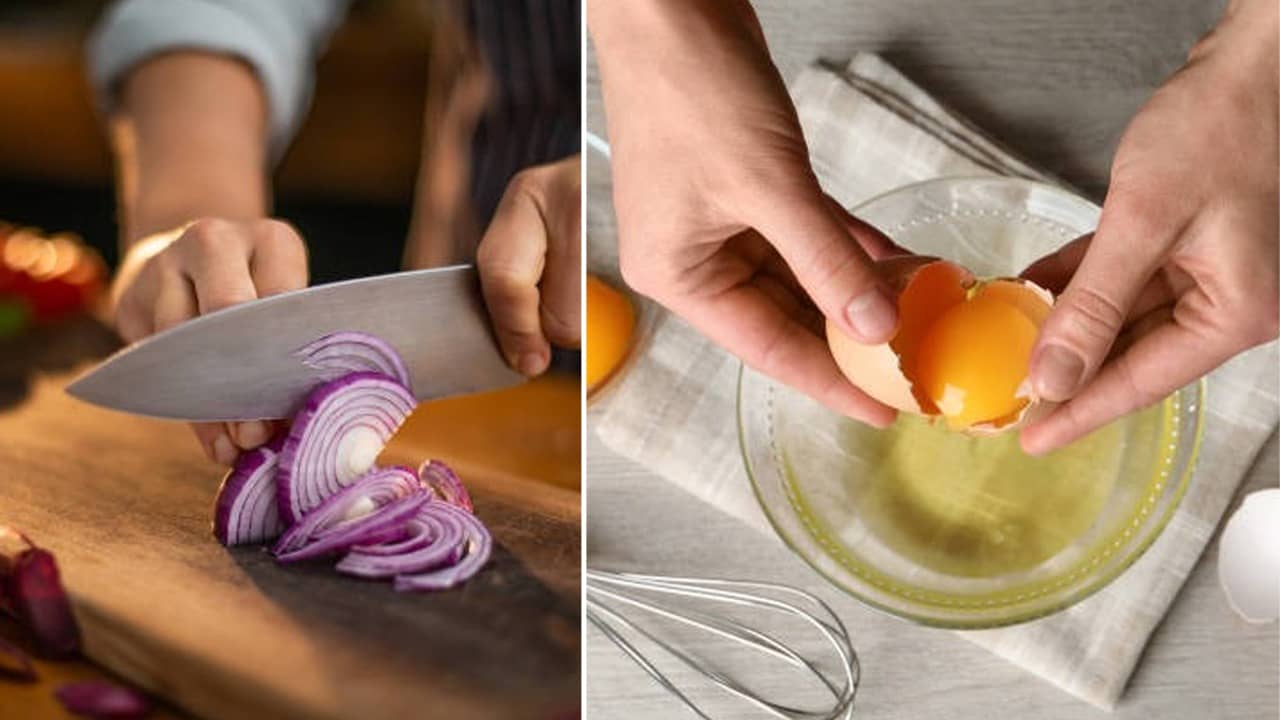 তিনটে মাঝারি সাইজের পেঁয়াজ ঝিরি ঝিরি করে কেটে নিতে হবে। একটা বড় বাটিতে এই পেঁয়াজ নিয়ে তিন -চার চামচ পেঁয়াজ আগেই অন্য বাটিতে সরিয়ে রাখতে হবে। কাঁচালঙ্কা কুচি করে নিতে হবে