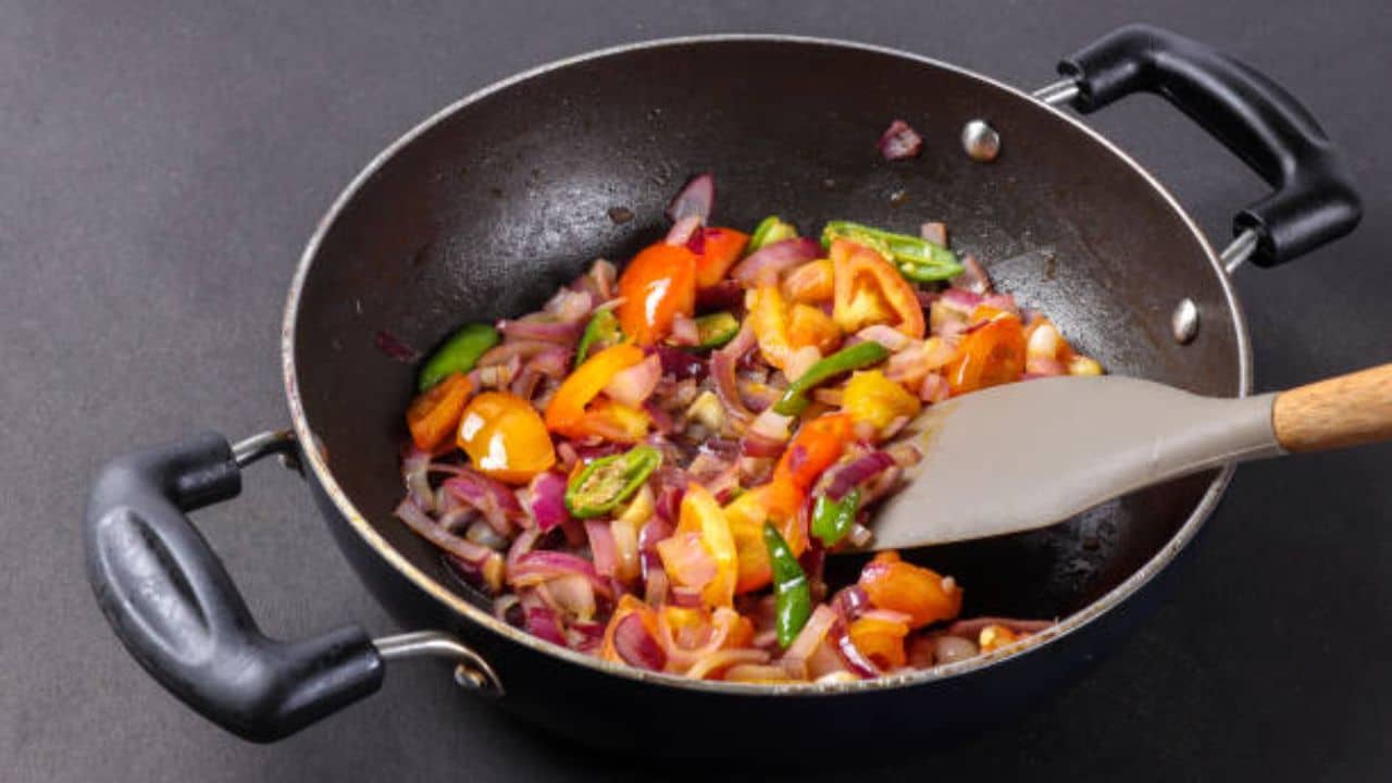 পেঁয়াজ, টমেটো গোটা গোটা রাখুন। পেঁয়াজের খোসা ছাড়িয়ে আর টমেটোর মুখ কেটে তেলের মধ্যে ভাজতে দিতে হবে। তেল থেকে ভেজে নেওয়া পেঁয়াজ-টমেটো তুলে নিতে হবে। বাকি তেলে একটা ক্যাপসিকাম চৌকো করে ভেজে নিতে হবে