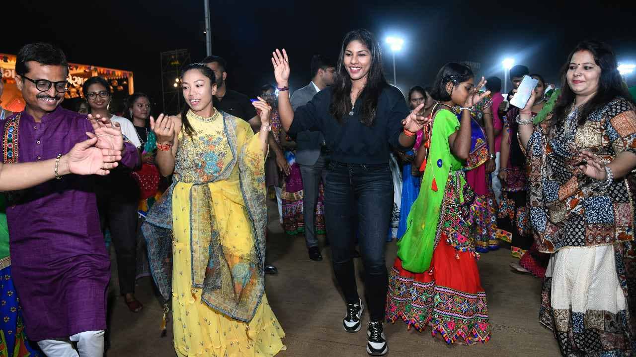 গান্ধীনগর কালচারাল ফোরামে গরবা ফেস্টিভ্যালে একফ্রেমে দেখা গিয়েছে জাতীয় গেমসে সোনা জয়ী দুই ভারতীয় তারকাকে। (ছবি-সাই মিডিয়া)
