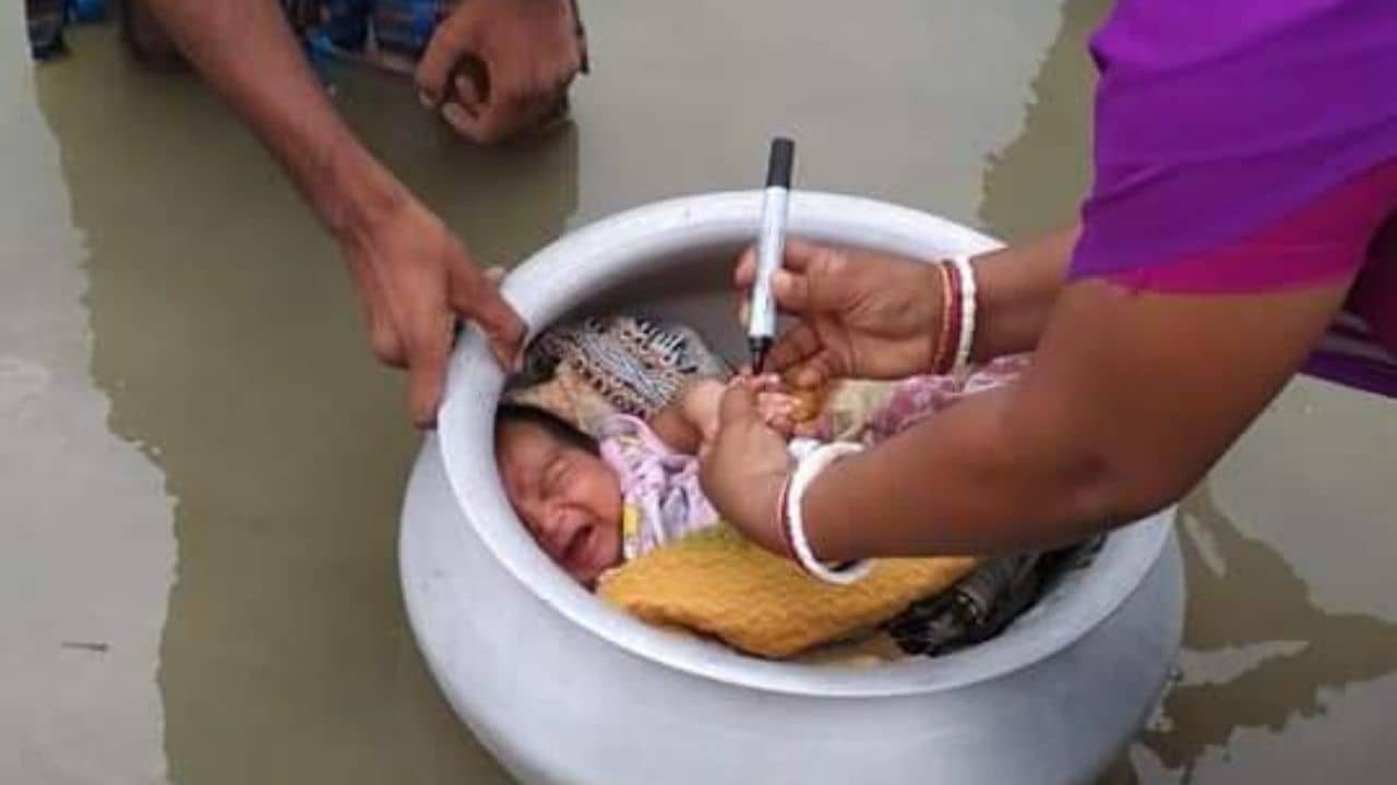 টানা বৃষ্টির জেরে কার্যত জলমগ্ন ক্যানিং। সেখানে সারেঙ্গাবাদ গ্রাম পঞ্চায়েতের সিংহেশ্বরীতে এক অভিনব কীর্তির সাক্ষী থাকলেন সকলে। দেখা গেল, জলের মধ্যেই ভাসছে হাঁড়ি। হাঁড়ির ঢাকনাটা অল্প খোলা, ভেতরে শায়িত সদ্যোজাত। পাশে হাঁটু জলে দাঁড়িয়ে বাবা। সেই অবস্থাতেই, হাঁড়ির ঢাকনাটা অল্প সরিয়ে এক স্বাস্থ্যকর্মী একরত্তির মুখে ফেলে দিলেন দুই ফোঁটা পোলিও। সেই ছবি সামনে আসতেই মুহূর্তে ভাইরাল।