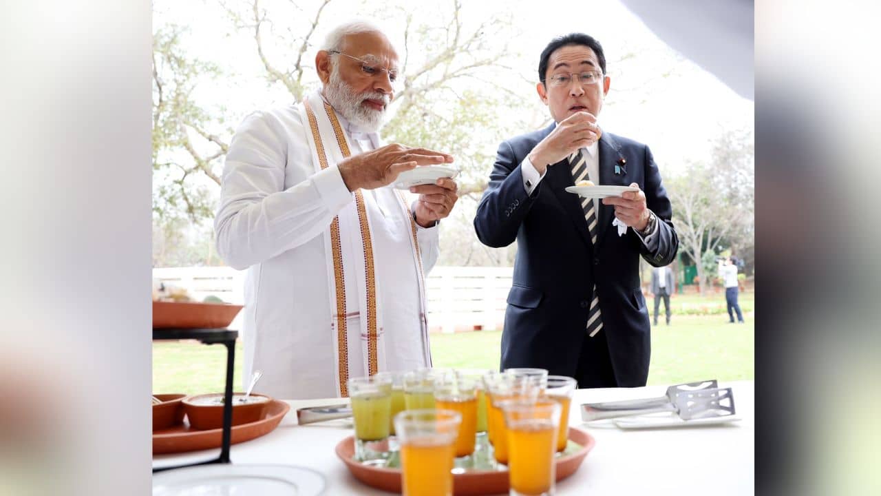 জাপানের প্রধানমন্ত্রী ফুনিও কিশিদার সঙ্গে 'চায়ে পে চর্চা'য় প্রধানমন্ত্রী নরেন্দ্র মোদী।