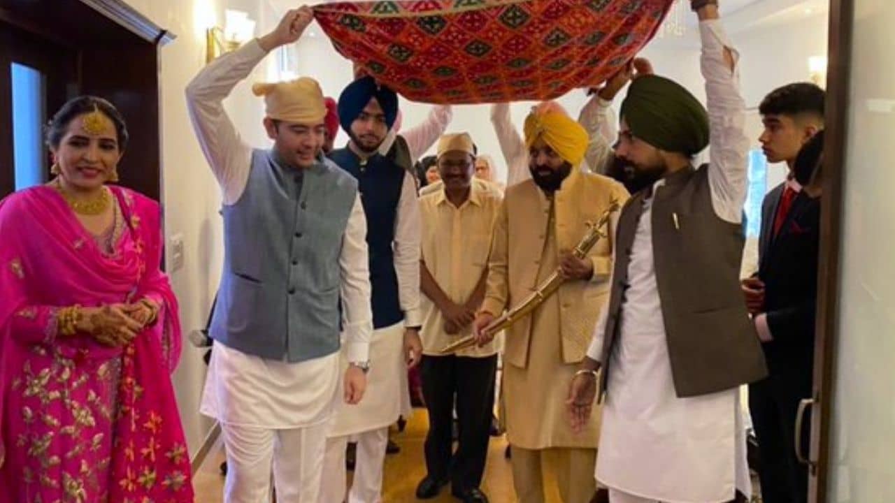 চিকিৎসক গুরুপ্রীত কৌরের সঙ্গে বিবাহের অনুষ্ঠানে পঞ্জাবের মুখ্যমন্ত্রী মান। এর আগে আরও একবার বিয়ে হয়েছিল ভগবন্তের। ছয় বছর আগে তাঁর বিবাহবিচ্ছেদ হয়েছিল। ছবি: টুইটার