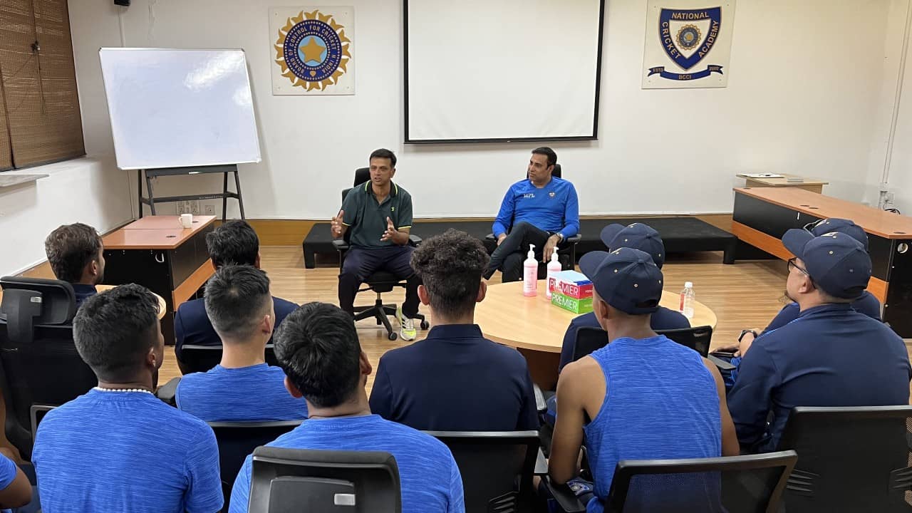 বর্তমান এনসিএ প্রধান ভিভিএস লক্ষ্মণও উপস্থিত ছিলেন রাহুলের নেওয়া ৪৫ মিনিটের বিশেষ ক্লাসে। (ছবি-বিসিসিআই টুইটার)