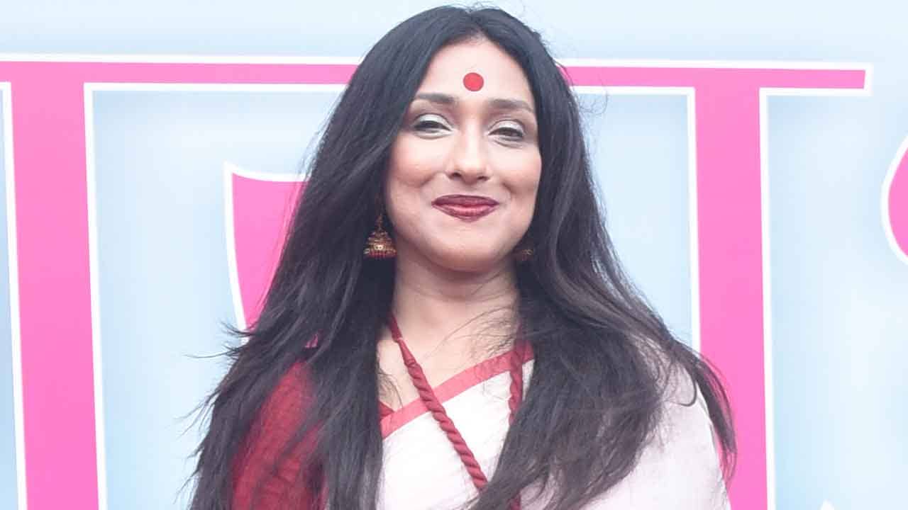 বড় লাল টিপ। লাল ব্লাউজ, সাদা শাড়ির আঁচলে মা দুর্গার মুখ। খোলা চুলের সাজে তিনিও যেন মা দুর্গার প্রতিরূপ। তিনি অর্থাৎ অভিনেত্রী ঋতুপর্ণা সেনগুপ্ত।