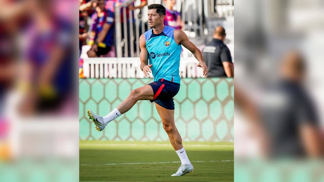 বার্সেলোনার জার্সি গায়ে চাপিয়ে, কাতালান ক্লাবের হয়ে মিয়ামিতে অনুশীলন করাও শুরু করে দিয়েছেন রবার্ট লেওয়ানডস্কি। (ছবি-বার্সা টুইটার)