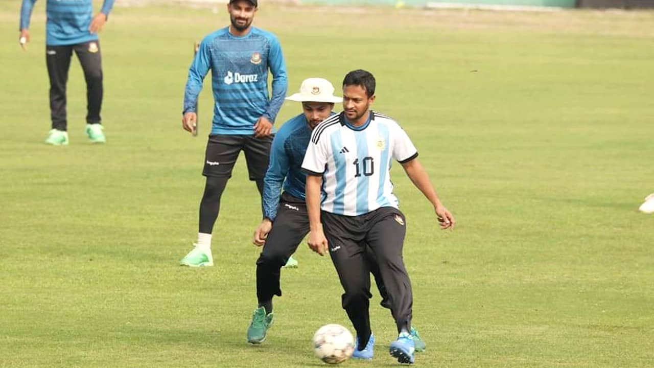 আর্জেন্টিনার জাতীয় ফুটবল দলের জার্সি পরেই নেমে পড়েছিলেন ফুটবল খেলতে। বোঝাই যাচ্ছে, বিশ্বকাপ শেষ হলেও সাকিবের মাথা এখনও ফুটবলে আচ্ছন্ন।(ছবি:টুইটার)